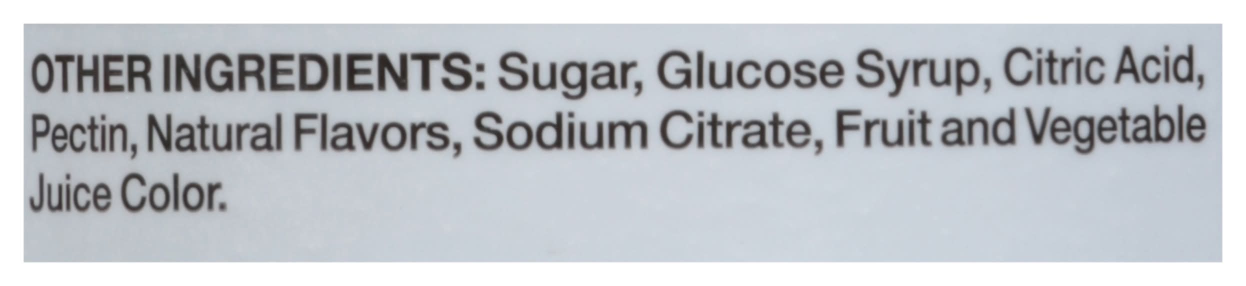 Ingredients: Other Ingredients: Sugar, Glucose Syrup, Citric Acid, Pectin, Natural Flavors, Sodium Citrate, Fruit and Vegetable Juice Color