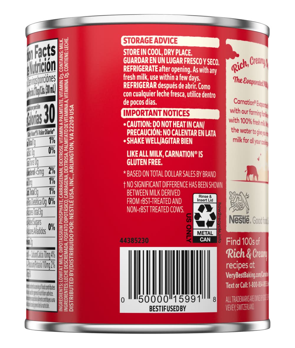 Crafted with the highest quality ingredients, Evaporated Milk is a milk with half the water removed, resulting in a creamy texture that enhances both sweet and savory recipes. This Evaporated Milk is ideal for creating indulgent dishes such as mac and cheese, mashed potatoes, flan, tres leches, pies, and fudge. Conveniently packaged in a recyclable metal can, It is designed for long shelf life, making it a practical addition to your pantry. Simply shake well before use, refrigerate after opening, and consume within a few days. Store in a cool, dry place to maintain its freshness and quality. • Nestle USA, Arlington ,VA, 22209 • Packaging: Reusable
