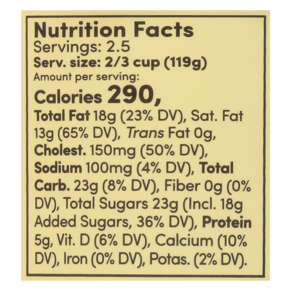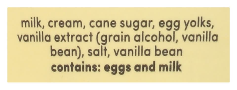 Ingredients: Milk, Cream, Cane Sugar, Egg Yolks, Vanilla Extract (Grain Alcohol, Vanilla Bean), Salt, Vanilla Bean Contains: Eggs, Milk