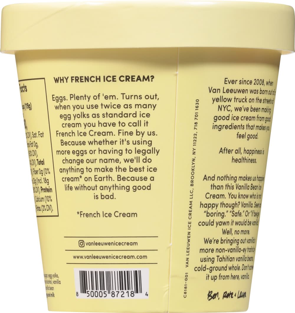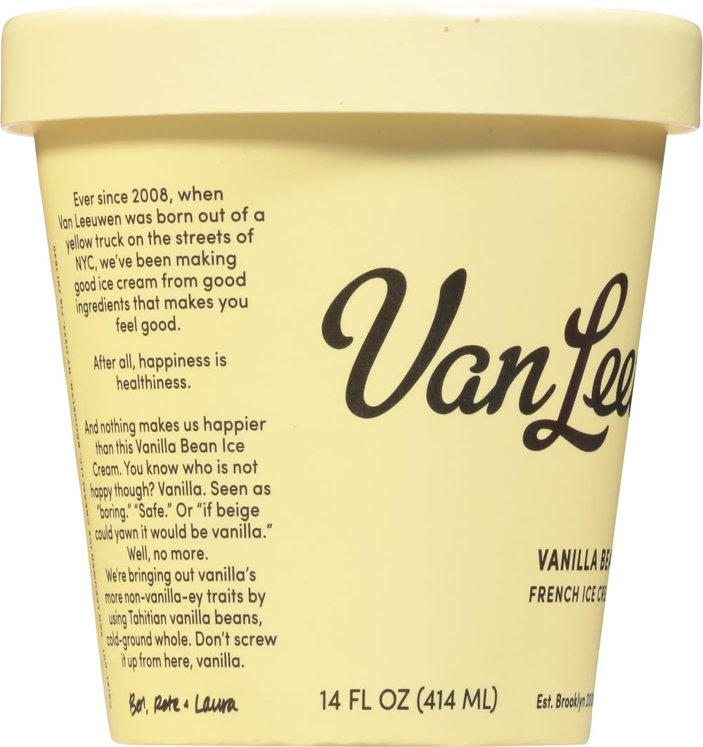 We started Van Leeuwen Ice Cream in a yellow truck on the streets of NYC in 2008 with a mission to make good ice cream that makes you feel good. Nowadays, people can spend so much time on what’s “healthy” they don’t stop to consider what’s healthy. As far as we’re concerned, happiness is healthiness. And nothing makes us happier than this Vanilla Bean Ice Cream. You know who is not happy though? Vanilla. Seen as “boring.” “Safe.” Or “if beige could yawn it would be vanilla.” Well, no more. We’re bringing out vanilla’s more non-vanilla-ey traits by using Tahitian vanilla beans, cold-ground whole. Don’t screw it up from here, vanilla. • Flavor: Vanilla bean • Van Leeuwen Ice Cream LLC, Brooklyn, NY, 11222