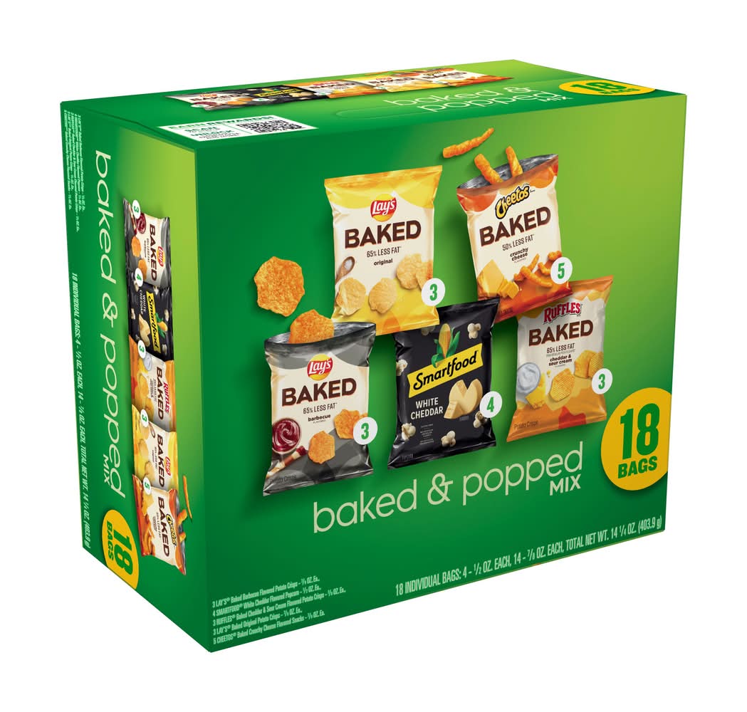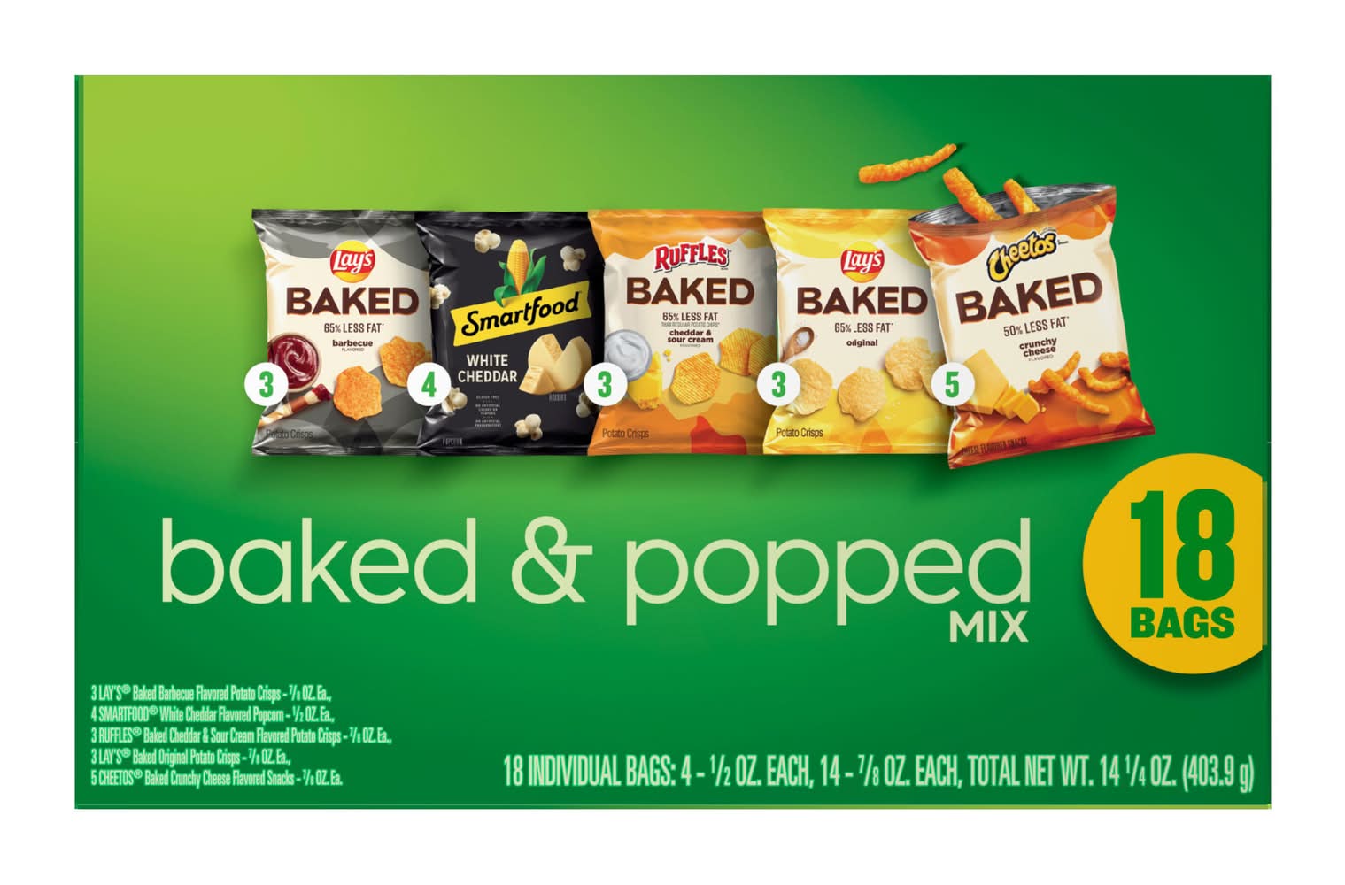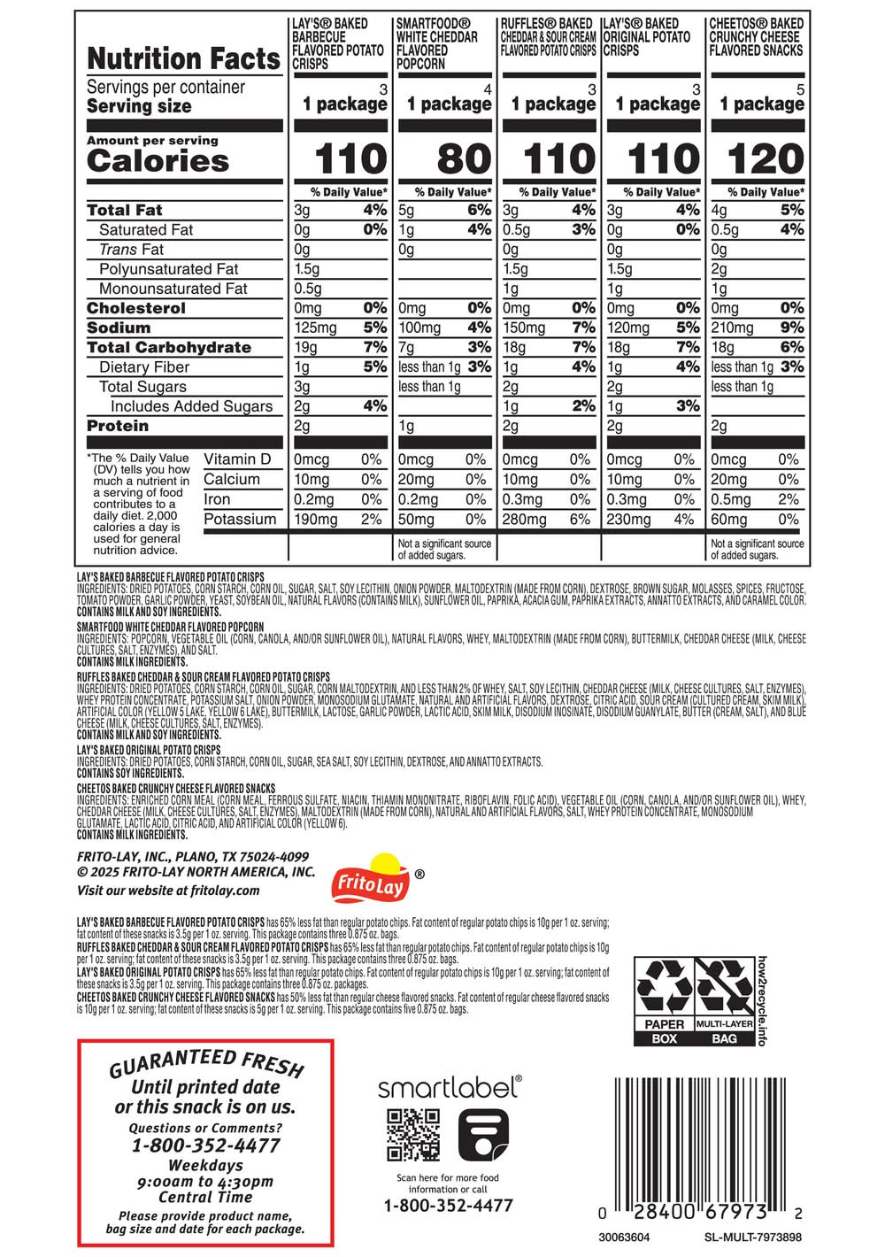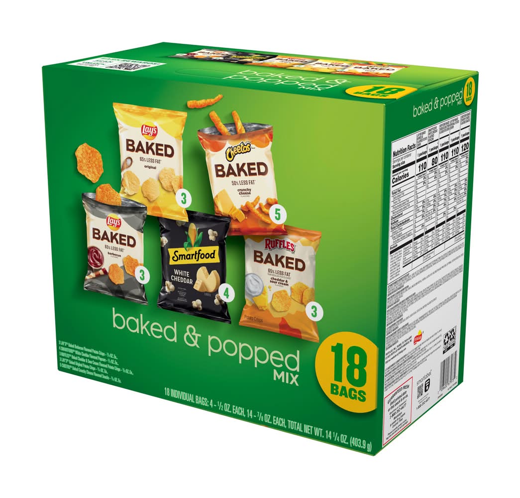 3 Baked Lay's barbecue flavored potato crisps - 7/8 oz. ea., 4 Smartfood white cheddar cheese flavored popcorn - 1/2 oz. ea., 3 Baked Ruffles cheddar & sour cream naturally & artificially flavored potato crisps - 7/8 oz. ea. 3 Baked Lay's original potato crisps - 7/8 oz. ea. 5 Baked Cheetos crunchy cheese flavored snacks - 7/8 oz. ea. 18 Individual Bags: 4 - 1/2 oz. each, 14 - 7/8 oz each. From summer barbecues to family gatherings to time spent relaxing at the end of a long day, Frito-Lay snacks are part of some of life's most memorable moments. And maybe even brightens some of the most mundane. • Flavor: Original-barbecue-white cheddar-cheddar & sour-crunchy cheese • Pack size: 18 • Frito-Lay, Inc., Plano, TX, 75024-4099