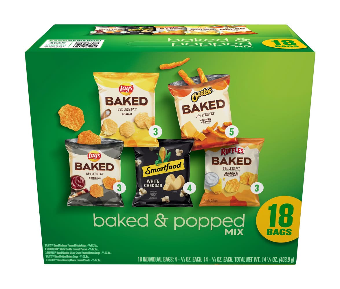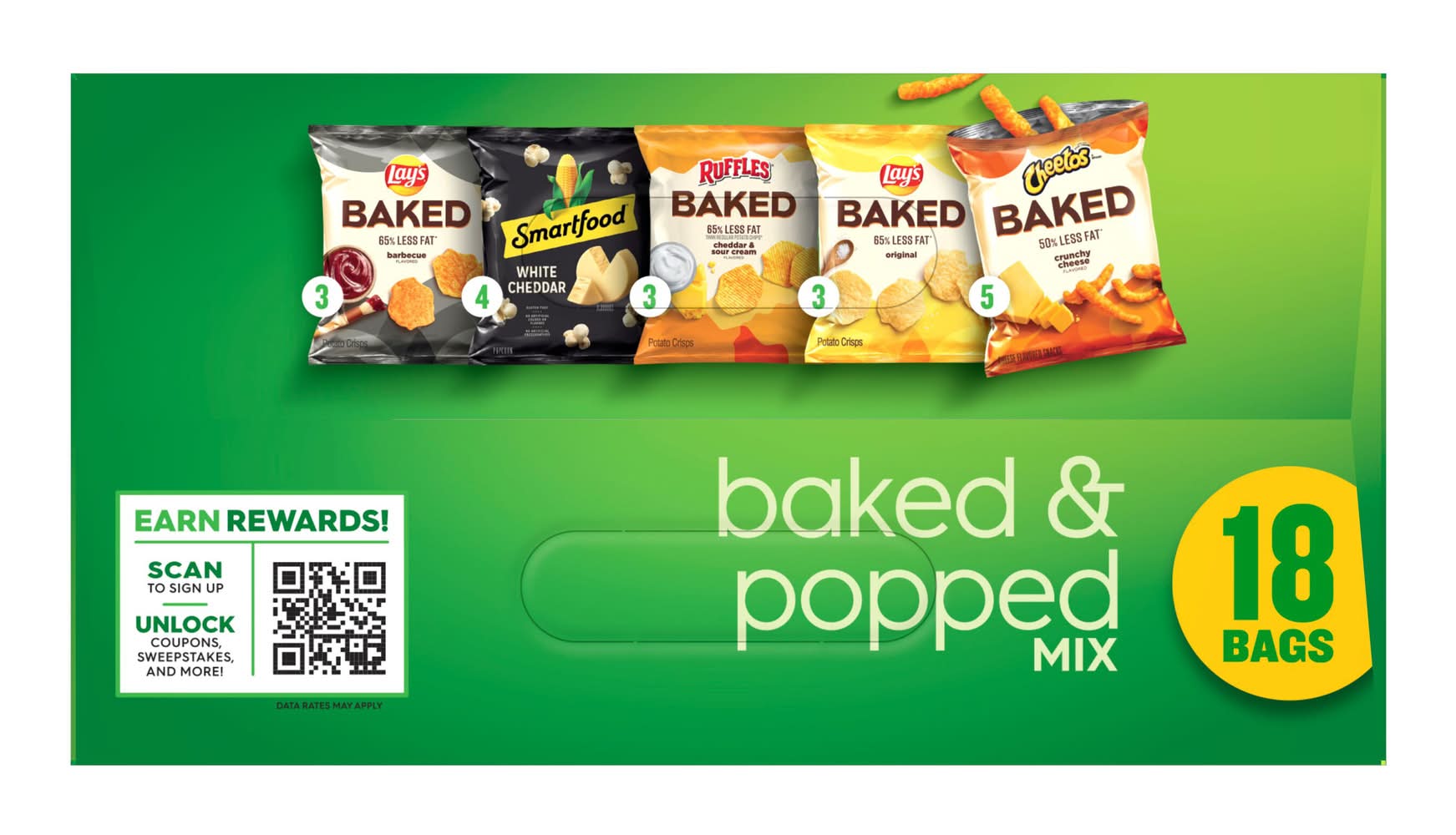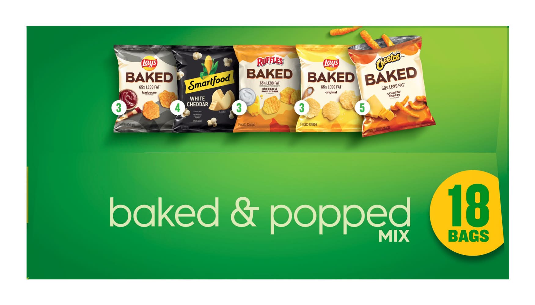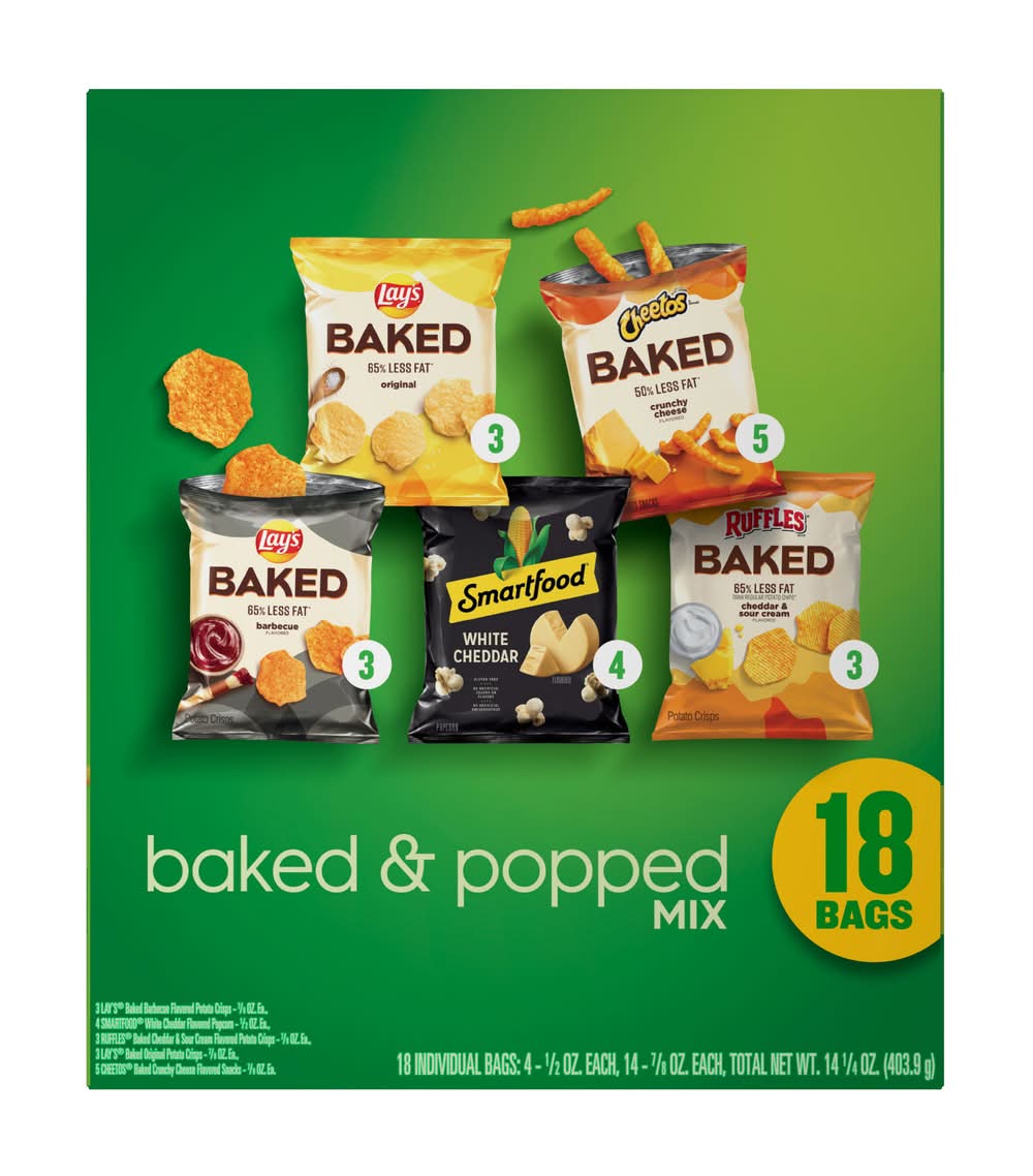 3 Baked Lay's barbecue flavored potato crisps - 7/8 oz. ea., 4 Smartfood white cheddar cheese flavored popcorn - 1/2 oz. ea., 3 Baked Ruffles cheddar & sour cream naturally & artificially flavored potato crisps - 7/8 oz. ea. 3 Baked Lay's original potato crisps - 7/8 oz. ea. 5 Baked Cheetos crunchy cheese flavored snacks - 7/8 oz. ea. 18 Individual Bags: 4 - 1/2 oz. each, 14 - 7/8 oz each. From summer barbecues to family gatherings to time spent relaxing at the end of a long day, Frito-Lay snacks are part of some of life's most memorable moments. And maybe even brightens some of the most mundane. • Flavor: Original-barbecue-white cheddar-cheddar & sour-crunchy cheese • Pack size: 18 • Frito-Lay, Inc., Plano, TX, 75024-4099