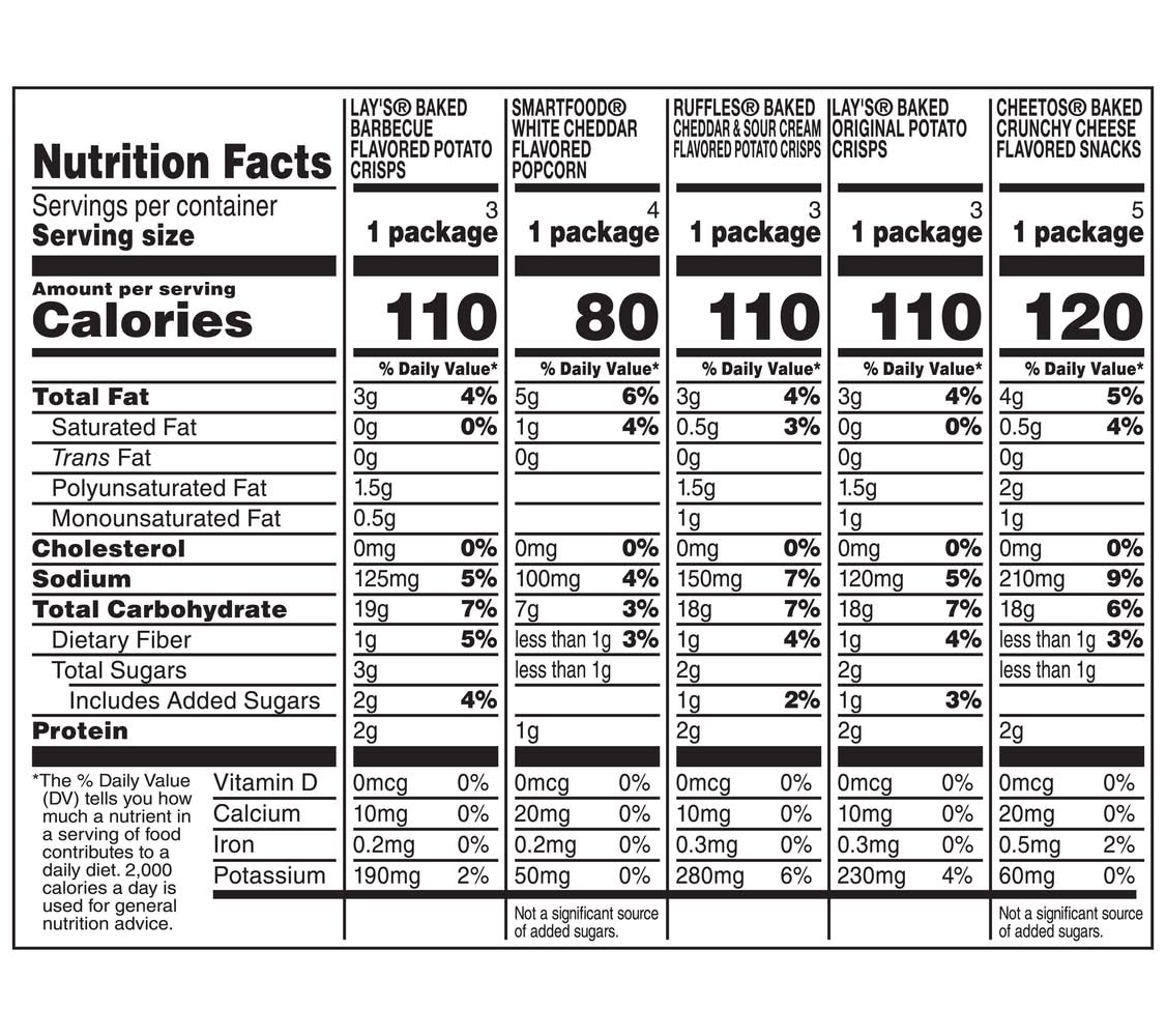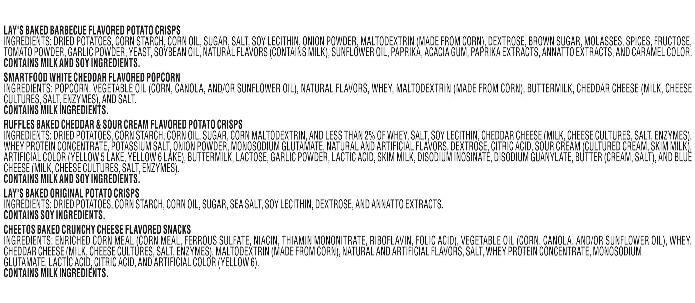 Ingredients: Lay's Baked Barbecue Flavored Potato Crisps Ingredients: Dried Potatoes, Corn Starch, Corn Oil, Sugar, Salt, SOY Lecithin, Onion Powder, Maltodextrin (Made From Corn), Dextrose, Brown Sugar, Molasses, Spices, Fructose, Tomato Powder, Garlic Powder, Yeast, SOYBEAN Oil, Natural Flavors (Contains Milk), Sunflower Oil, Paprika, Acacia Gum, Paprika Extracts, Annatto Extracts, And Caramel Color. CONTAINS MILK AND SOY INGREDIENTS. Smartfood White Cheddar Flavored Popcorn Ingredients: Popcorn, Vegetable Oil (Corn, Canola, And/Or Sunflower Oil), Natural Flavors, Whey, Maltodextrin (Made From Corn), Buttermilk, Cheddar Cheese (Milk, Cheese Cultures, Salt, Enzymes), And Salt. CONTAINS MILK INGREDIENTS. Ruffles Baked Cheddar Sour Cream Flavored Potato Crisps Ingredients: Dried Potatoes, Corn Starch, Corn Oil, Sugar, Corn Maltodextrin, And Less Than 2% Of Whey, Salt, SOY Lecithin, Cheddar Cheese (Milk, Cheese Cultures, Salt, Enzymes), Whey Protein Concentrate, Potassium Salt, Onion Powder, Monosodium Glutamate, Natural And Artificial Flavors, Dextrose, Citric Acid, Sour Cream (Cultured Cream, Skim Milk), Artificial Color (Yellow 5 Lake, Yellow 6 Lake), Buttermilk, Lactose, Garlic Powder, Lactic Acid, Skim Milk, Disodium Inosinate, Disodium Guanylate, Butter (Cream, Salt), And Blue Cheese (Milk, Cheese Cultures, Salt, Enzymes), . CONTAINS MILK AND SOY INGREDIENTS. Lay's Baked Original Potato Crisps Ingredients: Dried Potatoes, Corn Starch, Corn Oil, Sugar, Sea Salt, SOY Lecithin, Dextrose, And Annatto Extracts. CONTAINS SOY INGREDIENTS. Cheetos Baked Crunchy Cheese Flavored Snacks Ingredients: Enriched Corn Meal (Corn Meal, Ferrous Sulfate, Niacin, Thiamin Mononitrate, Riboflavin, Folic Acid), Vegetable Oil (Corn, Canola, And/Or Sunflower Oil), Whey, Cheddar Cheese (Milk, Cheese Cultures, Salt, Enzymes), Maltodextrin (Made From Corn), Natural And Artificial Flavors, Salt, Whey Protein Concentrate, Monosodium Glutamate, Lactic Acid, Citric Acid, And Artificial Color (Yellow 6), . CONTAINS MILK INGREDIENTS. Contains: CONTAINS MILK AND SOY INGREDIENTS.