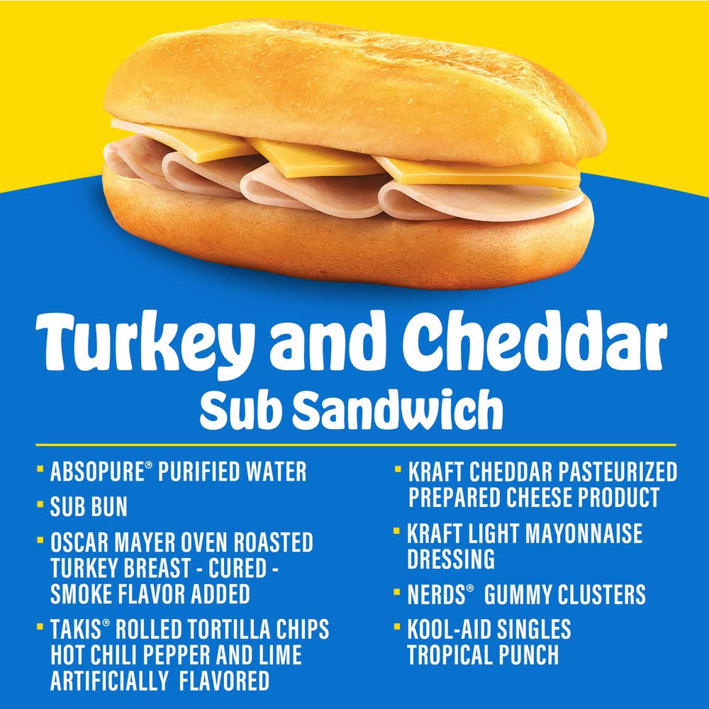 There is no substitute for a good lunch, and our Lunchables Uploaded Turkey and Cheddar Sub Sandwich Snack Kit knows a thing or two about making lunchtime epic. Our Uploaded snack kit is stacked (pun intended) with deliciously epic food: a classic sub bun, Oscar Mayer oven-roasted cured turkey breast, Kraft light mayonnaise, Kraft cheddar pasteurized prepared cheese product, Takis Fuego Hot Chili Pepper and Lime Rolled Tortilla Chips, and as a refreshing drink, Absopure water and a Tropical Punch Kool-Aid Single drink mix. Built to be eaten, Lunchables come conveniently packaged for an easy school lunch bite or on-the-go snack, with individual compartments that can please even picky eaters. A lunchtime win, each snack kit has 13 grams of protein per serving, making it food kids love and parents trust. Make the most of your day with our Uploaded sub sandwich snack kit. Keep refrigerated until you're ready to dig into a delicious bite. Flavor: Turkey & cheddar