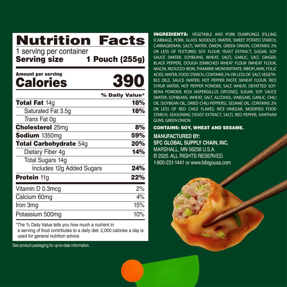 Ingredients: INGREDIENTS: VEGETABLE AND PORK DUMPLINGS (FILLING [CABBAGE, PORK, GLASS NOODLES {WATER, SWEET POTATO STARCH, CARRAGEENAN, SALT}, WATER, ONION, GREEN ONION, CONTAINS 2% OR LESS OF TEXTURED SOY FLOUR, YEAST EXTRACT, SUGAR, SOY SAUCE {WATER, SOYBEANS, WHEAT, SALT}, GARLIC, SALT, GINGER, BLACK PEPPER], DOUGH [ENRICHED WHEAT FLOUR {WHEAT FLOUR, NIACIN, REDUCED IRON, THIAMINE MONONITRATE, RIBOFLAVIN, FOLIC ACID}, WATER, FOOD STARCH, CONTAINS 2% OR LESS OF: SALT, VEGETABLE OIL]), SAUCE (WATER, HOT PEPPER PASTE [WHEAT FLOUR, RICE SYRUP, WATER, HOT PEPPER POWDER, SALT, WHEAT, DEFATTED SOYBEAN POWDER, DISTILLED ALCOHOL, WHEAT KOJI {ASPERGILLUS ORYZAE}], SUGAR, SOY SAUCE [WATER, SOYBEANS, WHEAT, SALT, ALCOHOL, VINEGAR], GARLIC, CHILI OIL [SOYBEAN OIL, DRIED CHILI PEPPERS], SESAME OIL, CONTAINS 2% OR LESS OF RED CHILE FLAKES, RICE VINEGAR, MODIFIED FOOD STARCH, SEASONING [YEAST EXTRACT, SALT], RED PEPPER, XANTHAN GUM), GREEN ONION. Contains: Wheat, Soy, Sesame