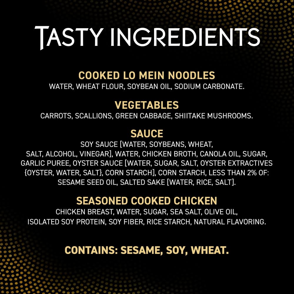 Ingredients: Cooked Lo Mein Noodles (Wheat Flour, Water, Soybean Oil, Sodium Carbonate), Sauce (Water, Soy Sauce [Water, Wheat, Soybeans, Salt, Alcohol, Vinegar], White Wine, Garlic Puree, Oyster Sauce [Water, Sugar, Salt, Oyster Extractives {Oyster, Water, Salt}, Corn Starch], Ginger Puree, Canola Oil, Sesame Seed Oil, Corn Starch, Less Than 2% Of: Chili Paste [Red Chili Peppers, Distilled Vinegar, Garlic, Salt], Chicken Broth, Natural Flavors, Mushroom Juice Concentrate, Salt), Seasoned Cooked Chicken (Chicken Breast, Water, Olive Oil, Brown Sugar, Sea Salt, Natural Flavorings), Vegetables (Shiitake Mushrooms, Carrots, Celery, Onions, Peas), . CONTAINS: SOY, WHEAT. Contains: Sesame, Shellfish, mollusk - oyster (Canada and EU), Soy, Wheat