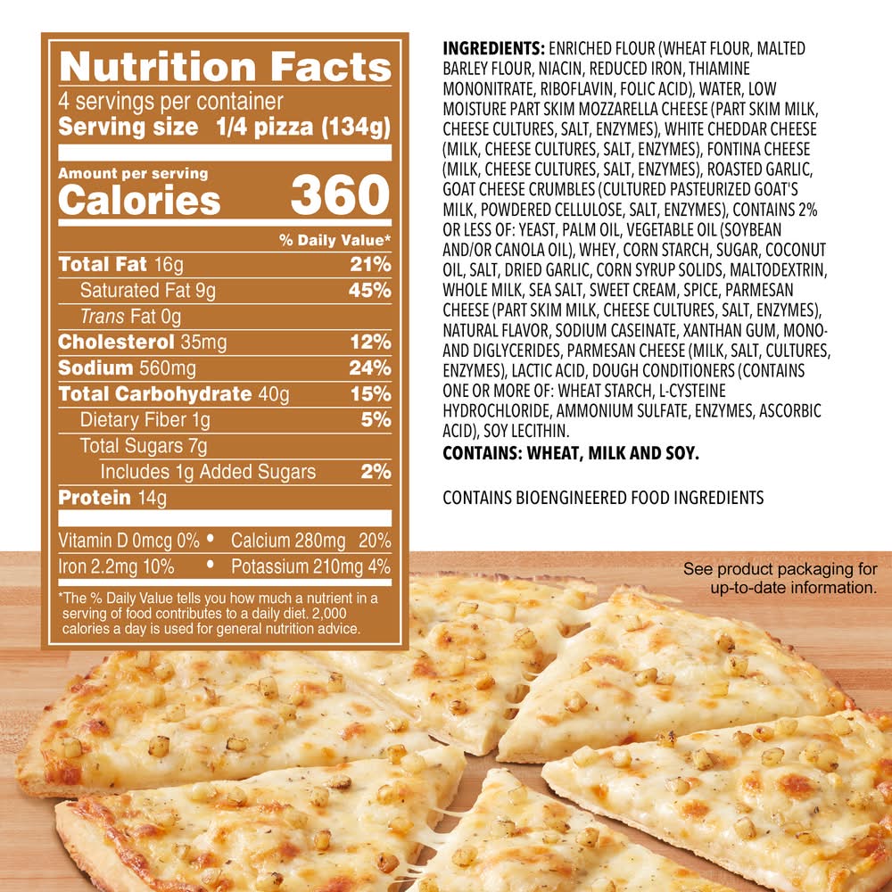 Ingredients: INGREDIENTS: ENRICHED FLOUR (WHEAT FLOUR, MALTED BARLEY FLOUR, NIACIN, REDUCED IRON, THIAMINE MONONITRATE, RIBOFLAVIN, FOLIC ACID), WATER, LOW MOISTURE PART SKIM MOZZARELLA CHEESE (PART SKIM MILK, CHEESE CULTURES, SALT, ENZYMES), WHITE CHEDDAR CHEESE (MILK, CHEESE CULTURES, SALT, ENZYMES), FONTINA CHEESE (MILK, CHEESE CULTURES, SALT, ENZYMES), ROASTED GARLIC, GOAT CHEESE CRUMBLES (CULTURED PASTEURIZED GOAT'S MILK, POWDERED CELLULOSE, SALT, ENZYMES), CONTAINS 2% OR LESS OF: YEAST, PALM OIL, VEGETABLE OIL (SOYBEAN AND/OR CANOLA OIL), WHEY, CORN STARCH, SUGAR, COCONUT OIL, SALT, DRIED GARLIC, CORN SYRUP SOLIDS, MALTODEXTRIN, WHOLE MILK, SEA SALT, SWEET CREAM, SPICE, PARMESAN CHEESE (PART SKIM MILK, CHEESE CULTURES, SALT, ENZYMES), NATURAL FLAVOR, SODIUM CASEINATE, XANTHAN GUM, MONO- AND DIGLYCERIDES, PARMESAN CHEESE (MILK, SALT, CULTURES, ENZYMES), LACTIC ACID, DOUGH CONDITIONERS (CONTAINS ONE OR MORE OF: WHEAT STARCH, L-CYSTEINE HYDROCHLORIDE, AMMONIUM SULFATE, ENZYMES, ASCORBIC ACID), SOY LECITHIN. Contains: Milk, Wheat, Soy Additives: Genetically Modified Ingredients