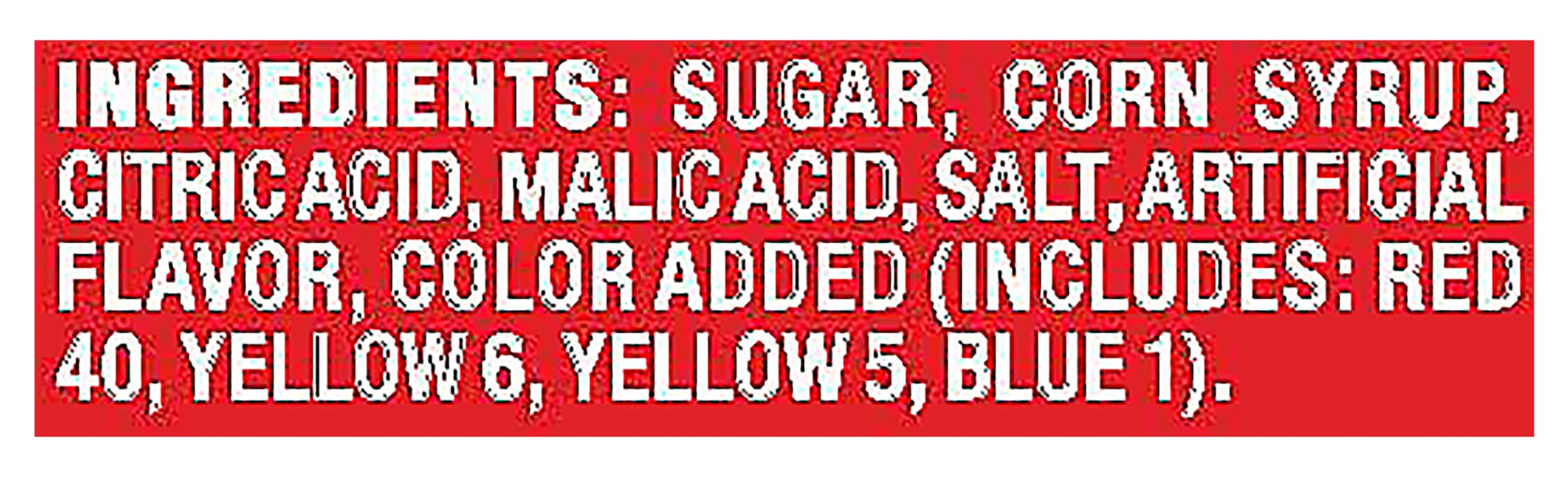 Ingredients: Sugar, Corn Syrup, Citric Acid, Malic Acid, Salt, Artificial Flavor, Color Added (Includes: Red 40, Yellow 6, Yellow 5, Blue 1) Contains: Corn