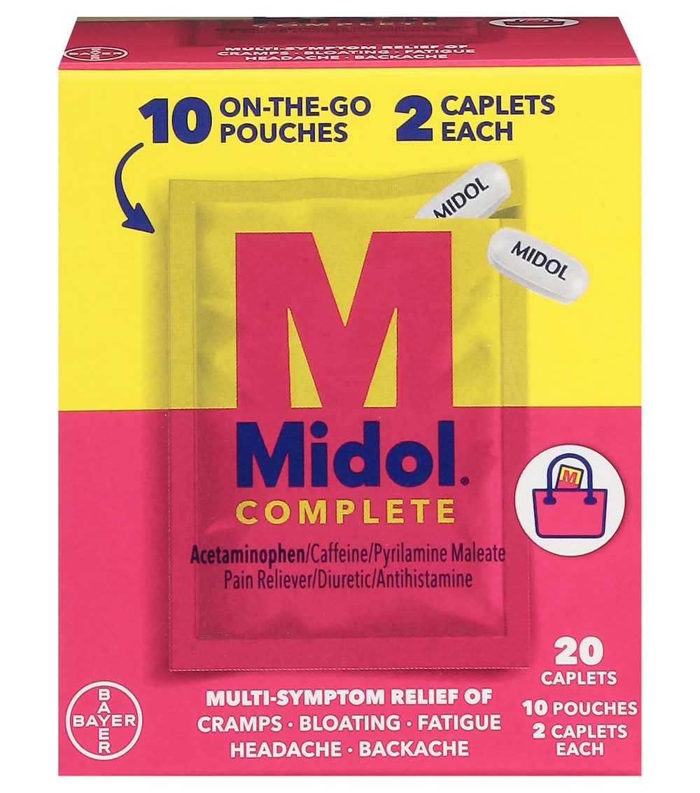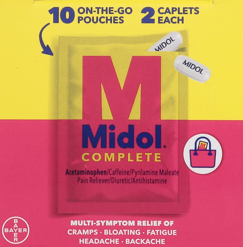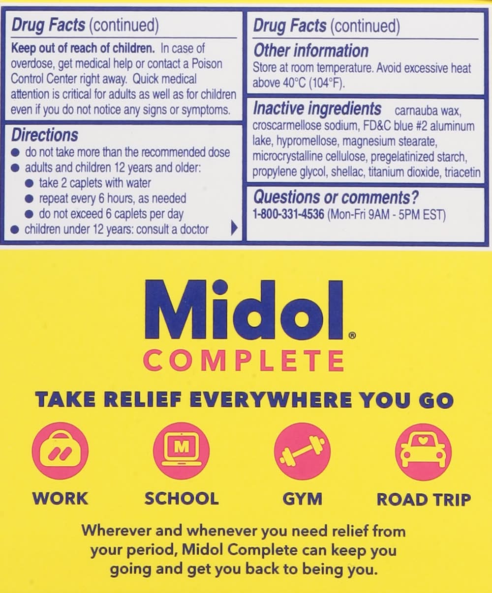 Midol Complete Menstrual Pain Relief Gelcaps with Acetaminophen for Menstrual Symptom Relief help you feel your best during and right before your period, delivering effective PMS and menstrual cramp relief in easy to take gelcap form. Midol Complete features a powerful formula with a pain reliever, diuretic and antihistamine. Combining acetaminophen with caffeine and pyrilamine maleate, these gelcaps provide muscle pain relief and bloating relief, as well as relief from period cramps, headache, back pain, water weight gain and fatigue. This period pain reliever is recommended for adults and children 12 years and older. Use as directed. Take two gelcaps with water and repeat every six hours as needed without exceeding six gelcaps a day. • Pack size: 2 • Bayer Healthcare LLC, Whippany, Nj, 07981.