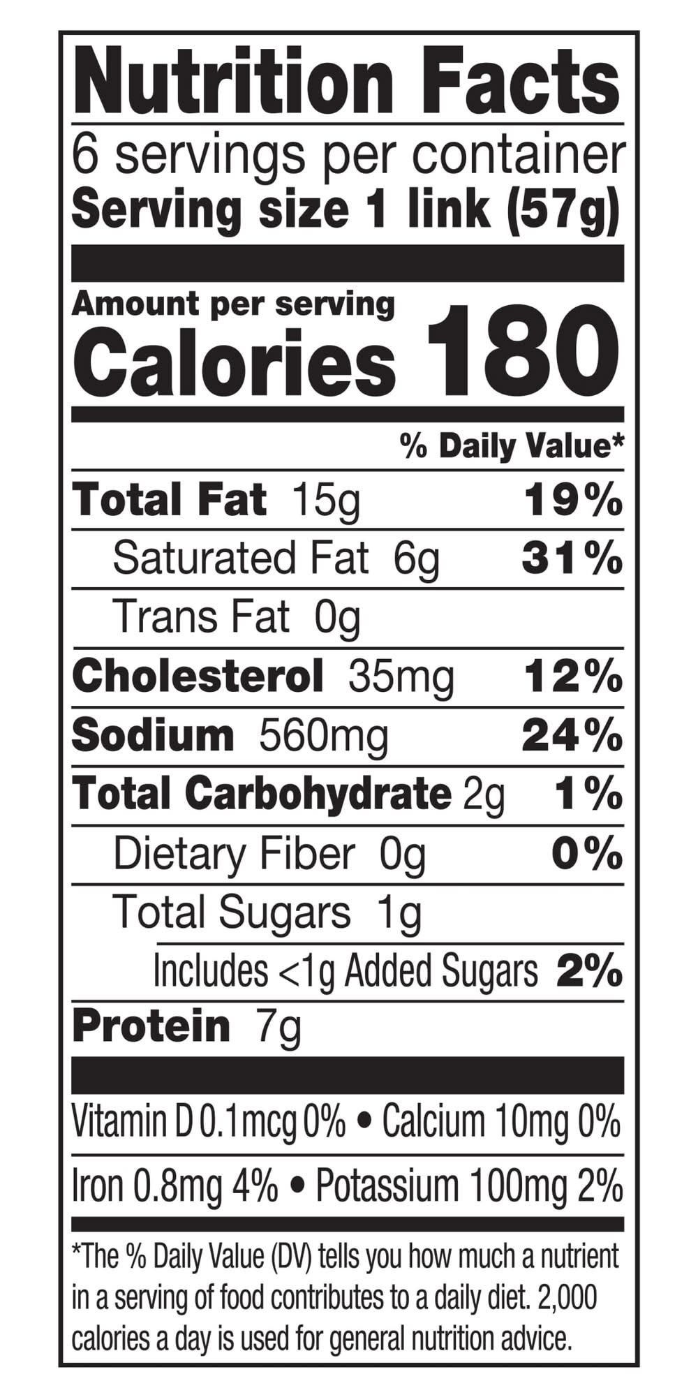 Directions for use: Preparation: Grill: Preheat grill to medium-low. Grill for 10-12 minutes or until heated through, turning links often. Stovetop: Bring 1/2 inch water to a boil in a pan. Add links; cover and simmer for 6-8 minutes or until heated through, turning once. Microwave: Place 1 link on a plate. Cover with a paper towel. Microwave on high for 30-35 seconds or until heated through. Let stand 1 minute before eating. Directions are based on an 1100 watt microwave. Storage & Handling: For optimum freshness, keep refrigerated and use by the date stamped on the package or freeze no longer than 30 days. Open package should be consumed within 7 days. Fully cooked. Keep refrigerated. Storage recommendation: For optimum freshness, keep refrigerated and use by the date stamped on the package or freeze no longer than 30 days. Open packages should be consumed within 7 days.