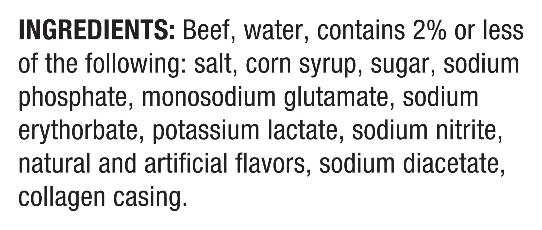 Ingredients: Beef, Water and Less Than 2% of the Following: Salt, Corn Syrup, Potassium Lactate, Sugar, Sodium Phosphate, Monosodium Glutamate, Sodium Diacetate, Sodium Erythorbate, Sodium Nitrite, Natural and Artificial Flavors, Collagen Casing