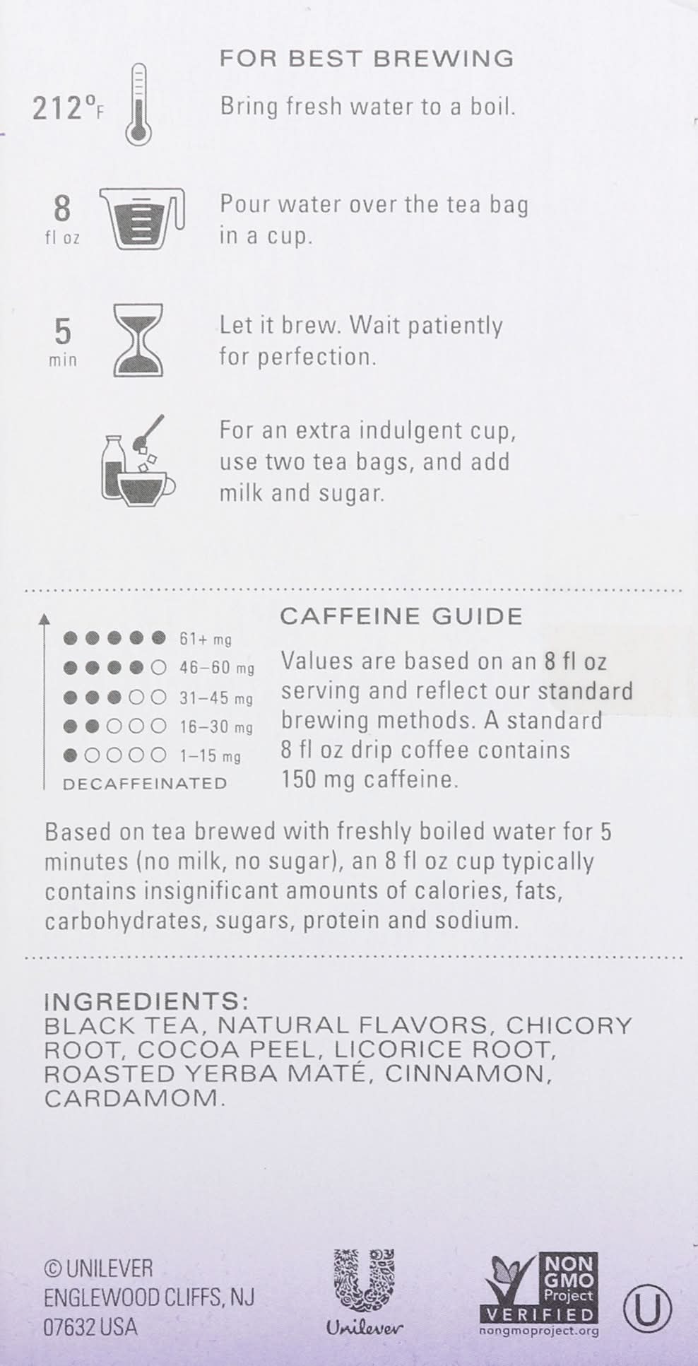 Ingredients: Black Tea, Natural Flavors, Chicory Root, Cocoa Peel, Licorice Root, Roasted Yerba Mate, Cinnamon, Cardamom