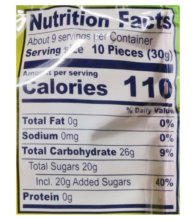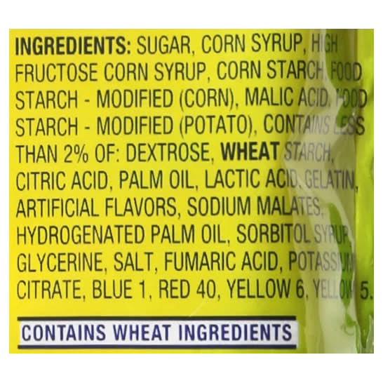Ingredients: Sugar, Corn Syrup, High Fructose Corn Syrup, Corn Starch, Food Starch - Modified (Corn), Malic Acid, Food Starch - Modified (Potato), Contains Less than 2% of: Dextrose, Wheat Starch, Citric Acid, Palm Oil, Lactic Acid, Gelatin, Artificial Flavors, Sodium Malates, Hydrogenated Palm Oil, Sorbitol Syrup, Glycerine, Salt, Fumaric Acid, Potassium Citrate, Blue 1, Red 40, Yellow 6, Yellow 5