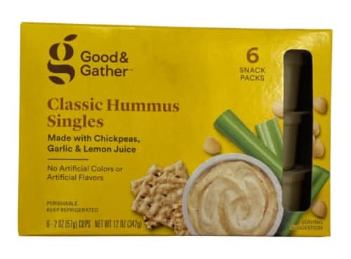 Bring home a traditional favorite with this Classic Hummus Snack Pack from Good & Gather™. This delicious hummus is made with chickpeas, garlic and lemon juice for a classic, traditional taste. It’s made with no artificial flavors or colors, and it comes with six 12-ounce containers so you can enjoy it throughout the week. Pair this classic hummus with pretzels, tortilla chips, fruit slices and more for a delectable treat that everyone will love. Every product that carries the Good & Gather™ name starts with quality ingredients that deliver great taste, making it easier for you and your family to eat well, every day. We promise you’ll love each bite, or your money back. • Flavor: Chickpeas- garlic-lemon juice • Packaging: Reusable