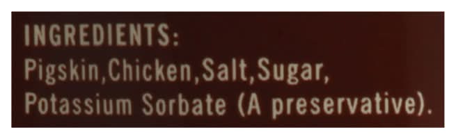 Ingredients: Pigskin, Chicken, Salt, Sugar, Potassium Sorbate (a Preservative)