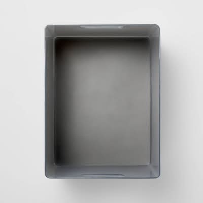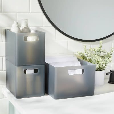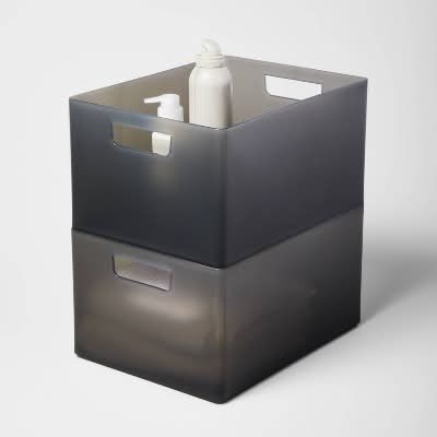 The Bathroom Organizer Bin with Handles from Brightroom gives you a helping hand in keeping your bathroom counter or cabinets organized. The bin is just the right size to fit on shelves, countertops or inside cupboards while still leaving room for other items. A modular design lets you stack and combine multiple bins to create the right setup to suit your organizational needs, and handles built into the bin make it easy to move and carry. The bin's simple construction coordinates with any color palette or decor style for easy incorporation into any bathroom. Brightroom started with a simple truth: When you’ve got it together, you feel better. Our versatile designs reveal the possibility in every closet, cupboard and drawer, and work together to create brilliant ways to organize your every day. • Color: Black • Size: Extra Large 12" x 9" x 6.5"