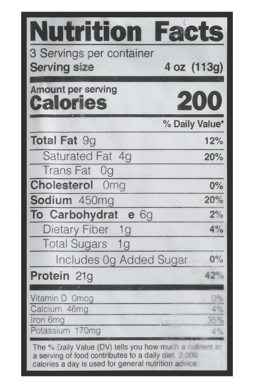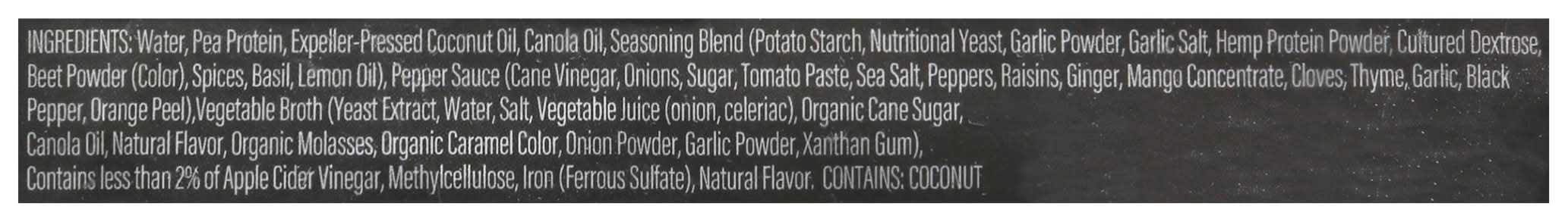 Ingredients: Water, Pea Protein, Expeller-Pressed Coconut Oil, Canola Oil, Seasoning Blend (Potato Starch, Nutritional Yeast, Garlic Powder, Garlic Salt, Hemp Protein Powder, Cultured Dextrose, Beet Powder (Color), Spices, Basil, Lemon Oil), Pepper Sauce (Cane Vinegar, Onions, Sugar, Tomato Paste, Sea Salt, Peppers, Raisins, Ginger, Mango Concentrate, Cloves, Thyme, Garlic, Black Pepper, Orange Peel), Vegetable Broth (Yeast Extract Water, Salt, Vegetable Juice (Onion, Celeriac), Organic Cane Sugar, Canola Oil, Natural Flavor, Organic Molasses, Organic Caramel Color, Onion Powder, Garlic Powder, Xanthan Gum), Contains Less than 2% of Apple Cider Vinegar, Methylcellulose, Iron (Ferrous Sulfate), Natural Flavor Contains: Tree Nuts