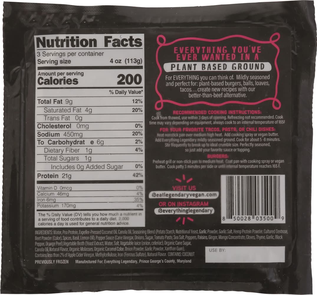 Directions for use: Directions: Recommended Cooking Instructions: Cook from thawed, use within 3 days of opening. Refreezing not recommended. Cook time may vary depending on equipment, always cook to an internal temperature of 165 F. For Your Favorite Tacos, Pasta, or Chili Dishes: Heat nonstick pan over medium high heat. Add cooking spray or vegan butter. Add Everything Legendary mildly seasoned ground. Cook for about 5-8 minutes. Stir frequently to break up to ideal crumble size. Perfectly seasoned, so just add your favorite sauce or topping. Burgers: Preheat grill or non-stick pan to medium heat. Coat pan with cooking spray or vegan butter. Cook patty 3 minutes per side or until internal temperature reaches 165 F. Perishable: Keep refrigerated. Storage recommendation: Perishable: Keep refrigerated.