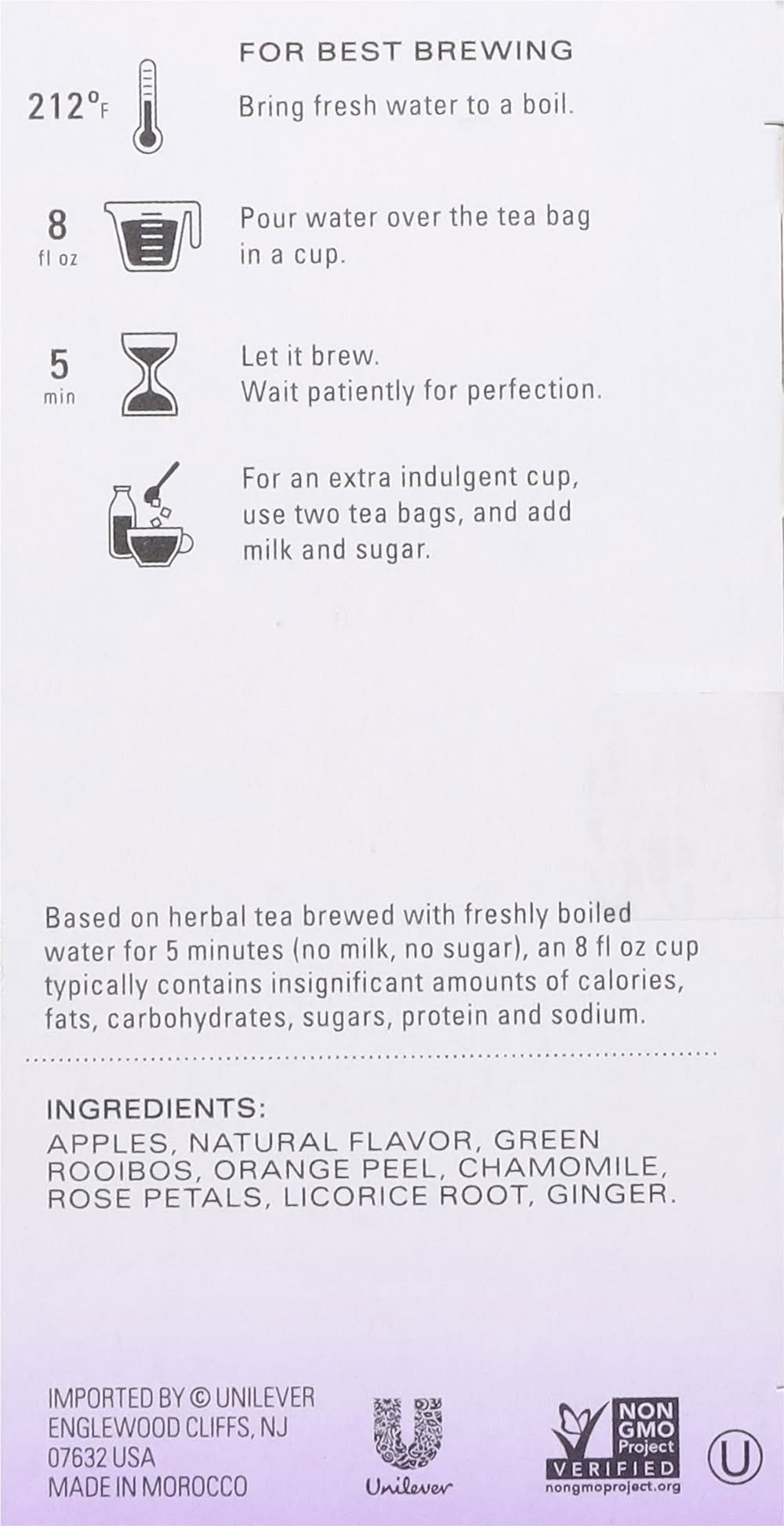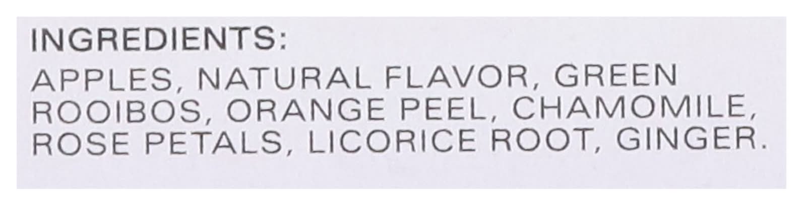 Ingredients: Apples, Natural Flavor, Green Rooibos, Orange Peel, Chamomile, Rose Petals, Licorice Root, Ginger