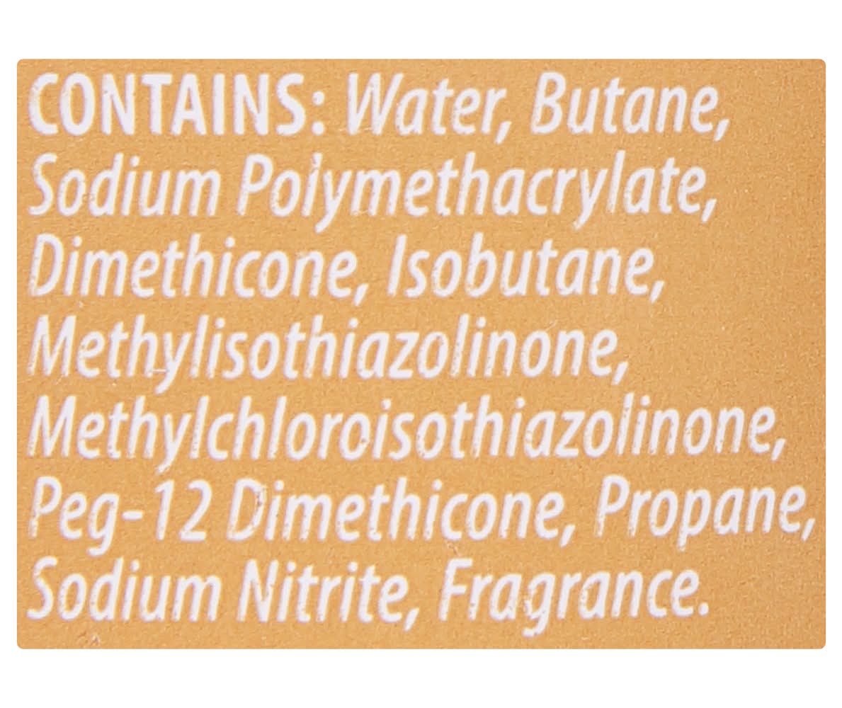Ingredients: Contains: Water, Butane, Sodium Polymethacrylate, Dimethicone, Isobutane, Methylisothiazolinone, Methylchloroisothiazolinone, PEG-12 Dimethicone, Propane, Sodium Nitrite, Fragrance
