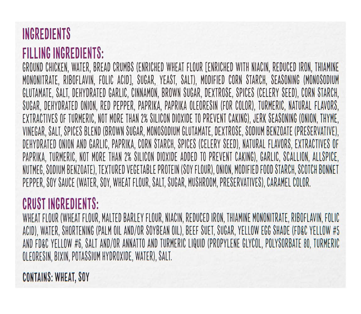 Ingredients: Filling Ingredients: Ground Chicken, Water, Bread Crumbs (Enriched Wheat Flour [Enriched with Niacin, Reduced Iron, Thiamine Mononitrate, Riboflavin, Folic Acid], Sugar, Yeast, Salt), Modified Corn Starch, Seasoning (Monosodium Glutamate, Salt, Dehydrated Garlic, Cinnamon, Brown Sugar, Dextrose, Spices (Celery Seed), Corn Starch, Sugar, Dehydrated Onion, Red Pepper, Paprika, Paprika Oleoresin (for Color), Turmeric, Natural Flavors, Extractives of Turmeric, Not More than 2% Silicon Dioxide to Prevent Caking), Jerk Seasoning (Onion, Thyme, Vinegar, Salt, Spices Blend (Brown Sugar, Monosodium Glutamate, Dextrose, Sodium Benzoate (Preservative), Dehydrated Onion and Garlic, Paprika, Corn Starch, Spices (Celery Seed), Natural Flavors, Extractives of Paprika, Turmeric, Not More than 2% Silicon Dioxide Added to Prevent Caking), Garlic, Scallion, Allspice, Nutmeg, Sodium Benzoate), Textured Vegetable Protein (Soy Flour), Onion, Modified Food Starch, Scotch Bonnet Pepper, Soy Sauce (Water, Soy, Wheat Flour, Salt, Sugar, Mushroom, Preservatives), Caramel Color. Crust Ingredients: Wheat Flour (Wheat Flour, Malted Barley Flour, Niacin, Reduced Iron, Thiamine Mononitrate, Riboflavin, Folic Acid), Water, Shortening (Palm or and/or Soybean Oil), Beef Suet, Sugar, Yellow Egg Shade (FD&C Yellow #5 and FD&C Yellow #6, Salt and/or Annatto and Turmeric Liquid (Propylene Glycol, Polysorbate 80, Turmeric Oleoresin, Bixin, Potassium Hydroxide, Water), Salt Contains: Wheat, Soybeans, Barley, Celery, Eggs