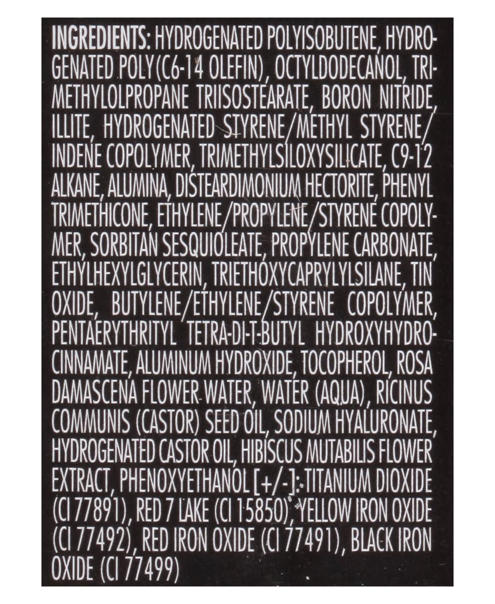 Ingredients: Hydrogenated Polyisobutene, Hydrogenated Poly(C6-14 Olefin), Octyindecanol, Trimethylolpropane Triisostearate Boron Nitride, Illite, Hydrogenated Styrene/Methyl Styrene/Indene Copolymer, Trimethylsiloxysilicate C9-12 Alkane Alumina, Disteardimonium Hectorite, Phenyl Trimethicone, Ethylene/Propylene/Styrene Copolymer, Sorbitan Sesquioleate, Propylene Carbonate, Ethylhexylglycerin, Triethoxycaprylylsilane, Tin Oxide, Butylene/Ethylene/Styrene Copolymer, Pentaerythrityl Tetra-Di-T 3utyl Hydroxyhydrocinnamate, Aluminum Hydroxide Tocopherol, Rosa Damascena Rower Water, Water (Aqua), Ricinus Communis (Castor) Seed Oil, Sodium Hyaluronate, Hydrogenated Castor Oil, Hibiscus Mutabilis Flower Extract, Phenoxyethanol [+/-]:- Titanium Dioxide (CI 77891), Red 7 Lake (CI 15850), Yellow Iron Oxide (CI 77492), Red Iron Oxide (CI 77491), Black Iron Oxide (CI 77499)