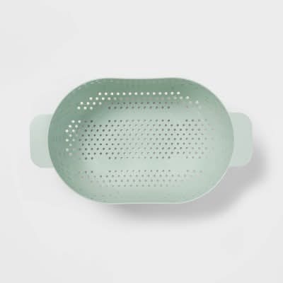 Simplify everyday cooking chores with the help of this Plastic Colander from Room Essentials™. Featuring a wide open top, this colander features a deep design with holes at the base, making it handy for straining pasta, boiling rice or spaghetti, cleaning fruits and vegetables, and removing liquid from canned food. Plus, it's designed with two integrated handles at the sides for easy handling. Showcasing a mint hue, it's sure to add a pop of color to your kitchen decor. Room Essentials™: Everyday Value Color: Mint green