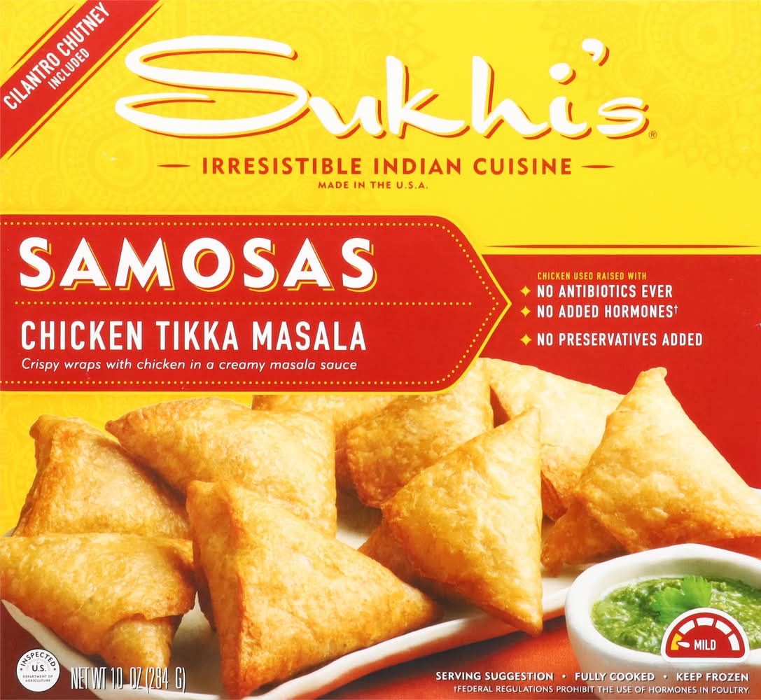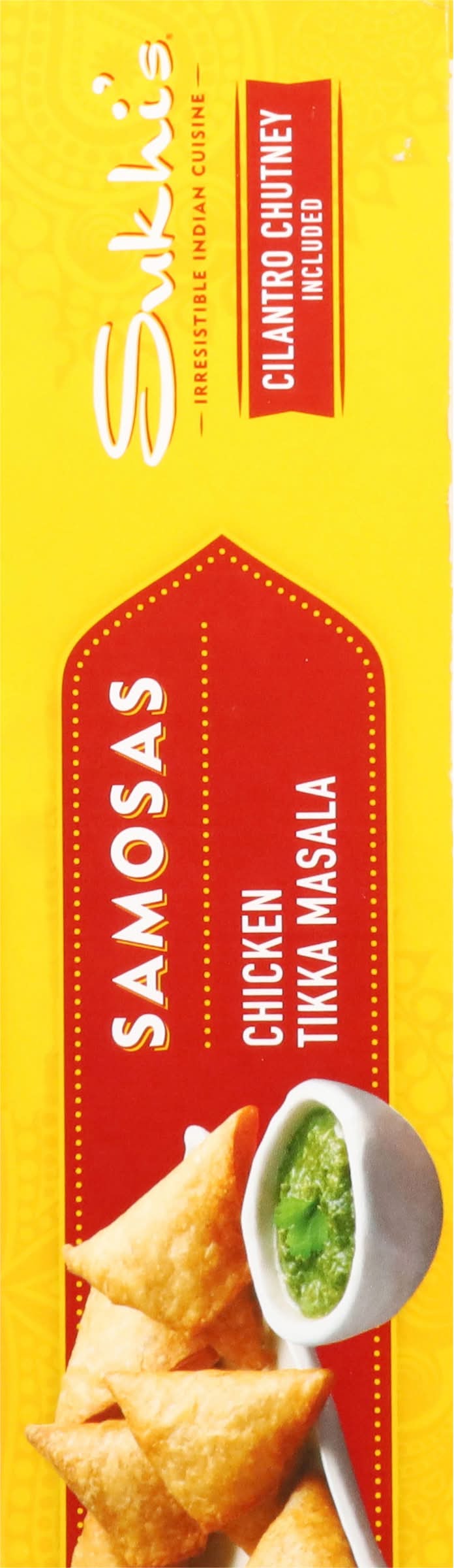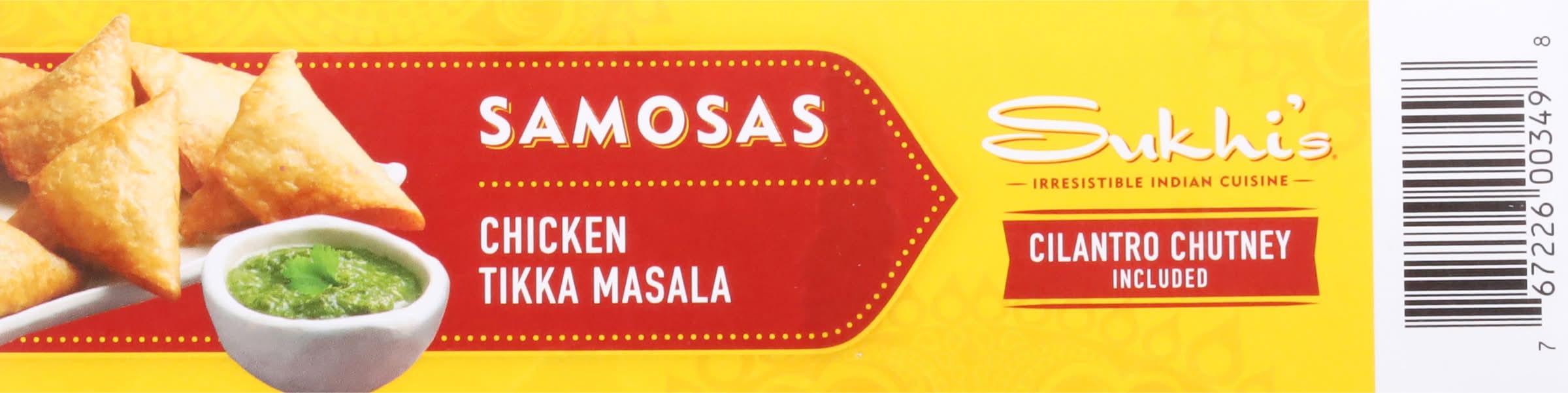 Crispy wraps with chicken in a creamy masala sauce. Certified Halal Since 1975. Cilantro chutney included. Irresistible Indian cuisine. Chicken Used Raised with: No antibiotics ever; no added hormones (Federal regulations prohibit the use of hormones in poultry); no preservatives added. Fully cooked. Approx 8 pieces. Sukhi's Chicken Tikka Masala Samosas make an appetizing side dish or snack. We've included our delectable Cilantro Chutney for dipping. Perfectly sized for party platters they will spice up any gathering of family or friends. Now it's easy to share Sukhi's irresistible flavors anytime! Chicken used has no added antibiotics or hormones (Federal regulations prohibit the use of hormones in poultry). There are two types of people: People who love Indian cuisine and the people who just haven't tried it yet. Come into my kitchen and fall in love - Sukhi Singh.