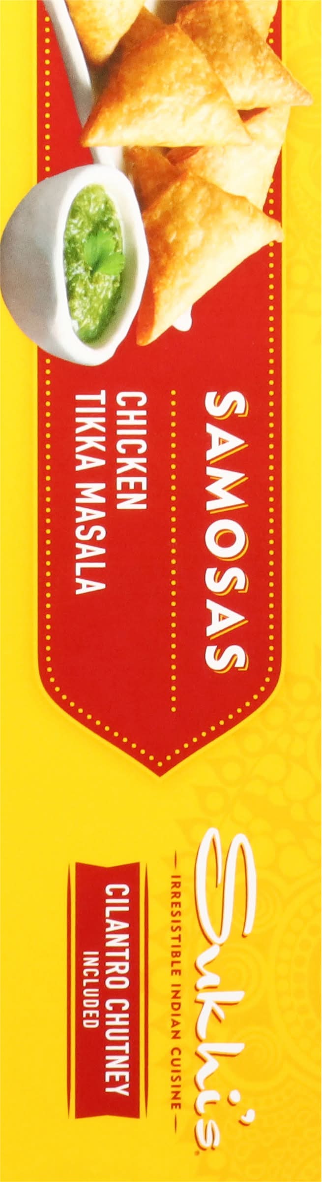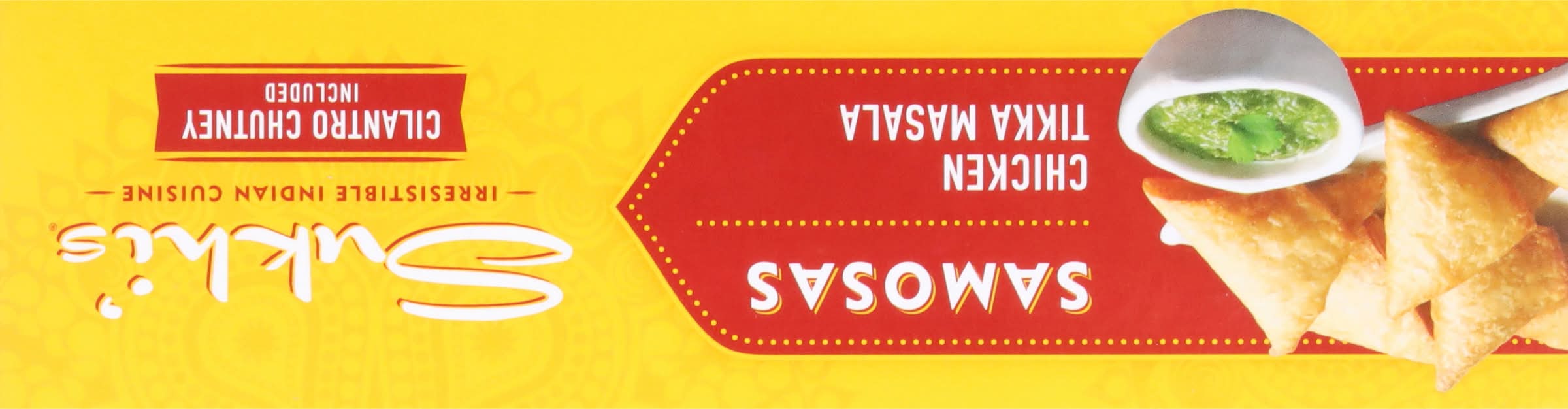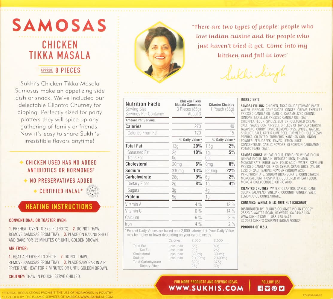 Crispy wraps with chicken in a creamy masala sauce. Certified Halal Since 1975. Cilantro chutney included. Irresistible Indian cuisine. Chicken Used Raised with: No antibiotics ever; no added hormones (Federal regulations prohibit the use of hormones in poultry); no preservatives added. Fully cooked. Approx 8 pieces. Sukhi's Chicken Tikka Masala Samosas make an appetizing side dish or snack. We've included our delectable Cilantro Chutney for dipping. Perfectly sized for party platters they will spice up any gathering of family or friends. Now it's easy to share Sukhi's irresistible flavors anytime! Chicken used has no added antibiotics or hormones (Federal regulations prohibit the use of hormones in poultry). There are two types of people: People who love Indian cuisine and the people who just haven't tried it yet. Come into my kitchen and fall in love - Sukhi Singh.