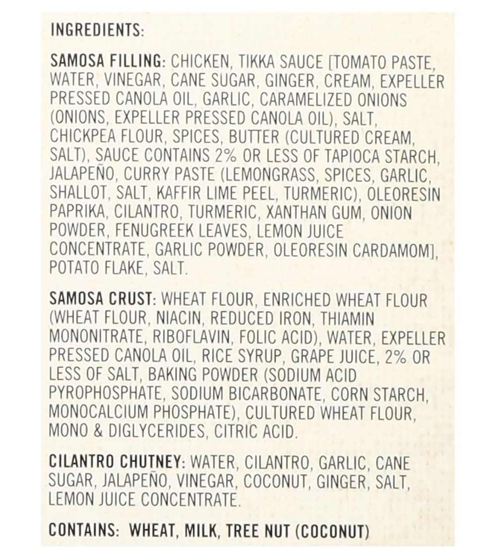 Ingredients: Samosa Filling: Chicken, Tikka Sauce [Tomato Paste, Water, Vinegar, Cane Sugar, Ginger, Cream, Expeller Pressed Canola Oil, Garlic, Caramelized Onions (Onions, Expeller Pressed Canola Oil), Salt, Chickpea Flour, Spices, Butter (Cultured Cream, Salt), Sauce Contains 2% or Less of Tapioca Starch, Jalapeno, Curry Paste (Lemongrass, Spices, Garlic, Shallot, Salt, Kaffir Lime Peel, Turmeric), Oleoresin Paprika, Cilantro, Turmeric, Xanthan Gum, Onion Powder, Fenugreek Leaves, Lemon Juice Concentrate, Garlic Powder, Oleoresin Cardamom], Potato Flake, Salt. Samosa Crust: Wheat Flour, Enriched Wheat Flour (Wheat Flour, Niacin, Reduced Iron, Thiamin Mononitrate, Riboflavin, Folic Acid), Water, Expeller Pressed Canola Oil, Rice Syrup, Grape Juice, 2% or less of Salt, Baking Powder (Sodium Acid Pyrophosphate, Sodium Bicarbonate, Corn Starch, Monocalcium Phosphate), Cultured Wheat Flour, Mono & Diglycerides, Citric Acid. Cilantro Chutney: Water, Cilantro, Garlic, Cane Sugar, Jalapeno, Vinegar, Coconut, Ginger, Salt, Lemon Juice Concentrate Contains: Wheat, Milk, Tree Nuts, Coconuts, Corn