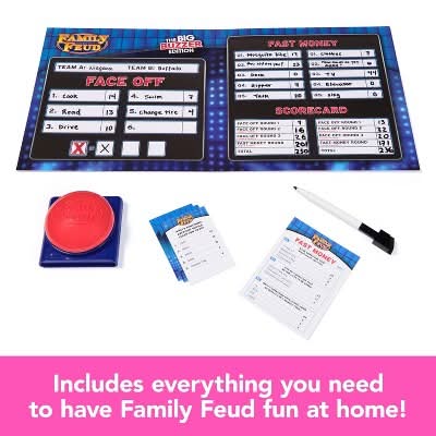 What makes the best game for family game night even better Survey says: a big, red electronic buzzer! Based on the popular TV game show, this Target-exclusive Family Feud Big Buzzer Game brings the iconic red buzzer from the show into your home for quick-thinking fun. Split into 2 teams, buzz in fast, then try to match the top answer from a nationwide survey to score the most points. Steal points from the other team if you know the best answers when they dont. The electronic Big Buzzer makes two different sounds: Face Off Buzzer and Wrong Answer. The competition heats up in the Fast Money Bonus Round, a head-to-head question challenge where top answers score triple points! Requires 2 AAA batteries. For 3 or more players, ages 8+. Find your newest favorite board game, beach games, & games for camp, plus amazing 12 year old girl gifts, 13 year old girl gifts & trending gifts for teens now. Shop more board games for family night, games for kids 8-12, children's games, family games for kids and adults, board games for 5-7 year olds, family board games & more to make big fun family memories with Spin Master!