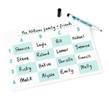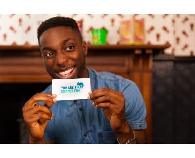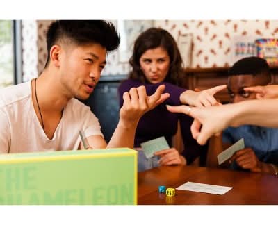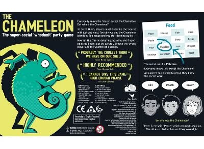Blend in. Don’t get caught. Six players. One word each. Everyone sounded pretty convincing, but someone isn’t who they say they are. That someone is The Chameleon. In each round of The Chameleon, a secret word is selected from a topic card in the middle of the table. Everyone knows what the word in the topic card is, except for the player with the Chameleon card… but which player is it? Using cunning, social deduction and some serious mob mentality, each player shouts out a related word to prove their innocence and tries to track down the imposter. Once everyone’s said their piece, the voting begins and the moment of truth arrives. In order to successfully track down the guilty player and win the game, players will have to use all of their teamwork and witch-hunting skills. If you’re the Chameleon, however, the rules are much more simple. Don’t. Get. Caught. • 40 topic cards, 14 code cards, 2 Chameleon cards, 1 six-sided die, 1 eight-sided die, 1 marker, 1 custom card, 1 clear sticker, 1 instruction sheet