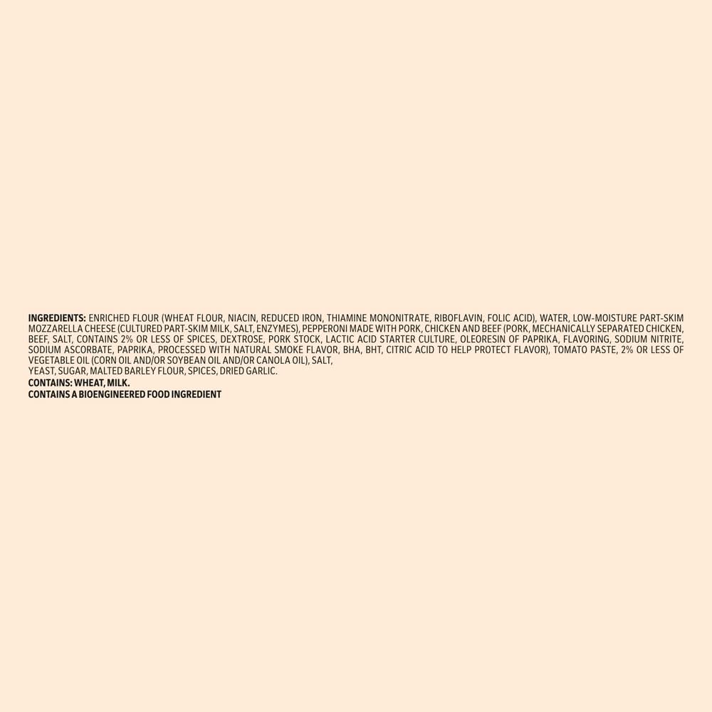 Ingredients: Enriched Flour (Wheat Flour, Malted Barley Flour, Niacin, Reduced Iron, Thiamine Mononitrate, Riboflavin, Folic Acid), Water, Low-Moisture Part-Skim Mozzarella Cheese (Part-Skim Milk, Cheese Culture, Salt, Enzymes), Pepperoni made with Pork, Chicken and Beef (Pork, Mechanically Separated Chicken, Beef, Salt, Contains 2% or Less of Spices, Dextrose, Pork Stock, Lactic Acid Starter Culture, Oleoresin of Paprika, Flavoring, Sodium Nitrite, Sodium Ascorbate, Paprika, processed with Natural Smoke Flavor, BHA, BHT, Citric Acid to help protect flavor), Tomato Paste, 2% or less of Vegetable Oil (Corn Oil and/or Soybean Oil and/or Canola Oil), Salt, Yeast, Sugar, Spices, Dried Garlic Contains: Wheat, Milk, Barley, Corn, Soybeans Additives: Genetically Modified Ingredients
