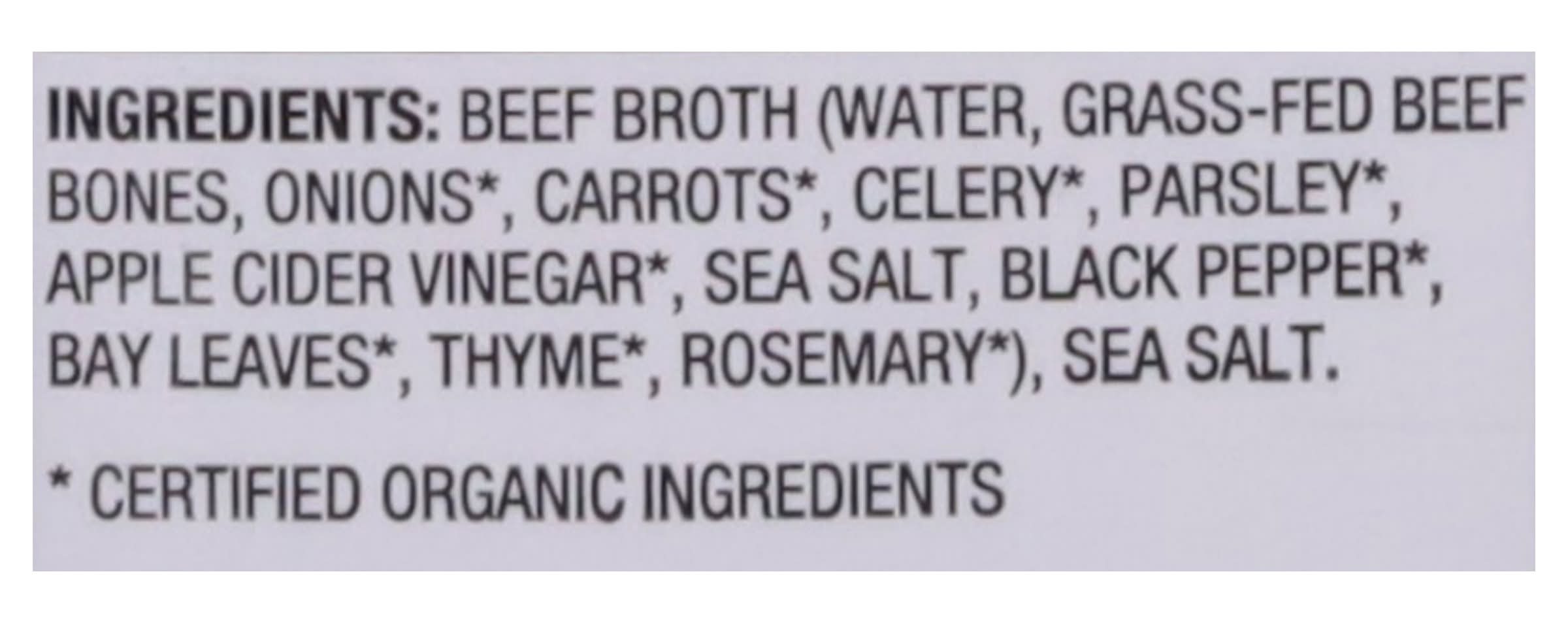 Ingredients: Beef Broth (Water, Grass-Fed Beef Bones, Onions, Carrots, Celery, Parsley, Apple Cider Vinegar, Sea Salt, Black Pepper, Bay Leaves, Thyme, Rosemary"),, Sea Salt Contains: Celery
