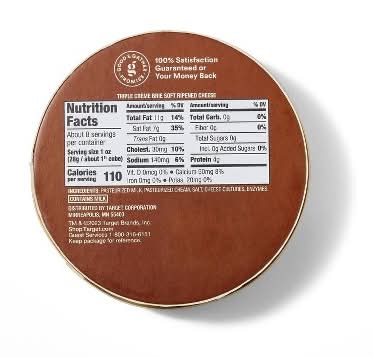 This Triple Creme Brie Cheese Wheel from Good & Gather™ is a delightfully creamy cheese that's perfect for entertaining. This 8-ounce wheel of soft-ripened triple creme brie makes a great pairing with crackers, cured meats, apple slices and more. Add it to a standout charcuterie board or app tray or treat yourself to a decadent panini. Every product that carries the Good & Gather™ name starts with quality ingredients that deliver great taste, making it easier for you and your family to eat well every day. We promise you’ll love each bite or your money back.