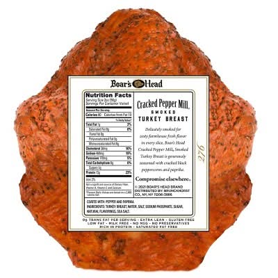 Boar’s Head® Cracked Pepper Mill™ Smoked Turkey Breast is generously seasoned with fragrant cracked black peppercorns and rich paprika then gently smoked to lock in all the rich flavors. The result is a zesty farmhouse flavor in every bite that’s versatile for all dayparts. American Heart Association Certified heart healthy, the turkey can be enjoyed for any occasion.