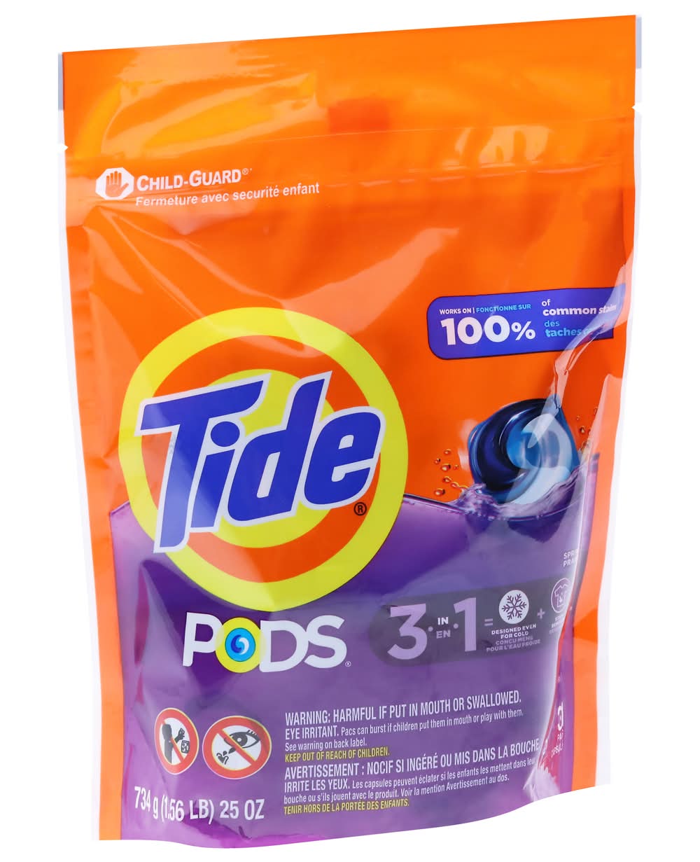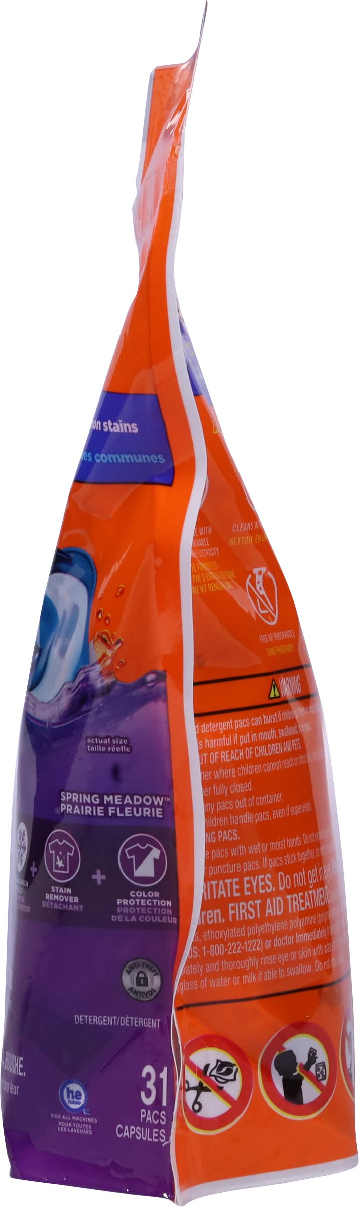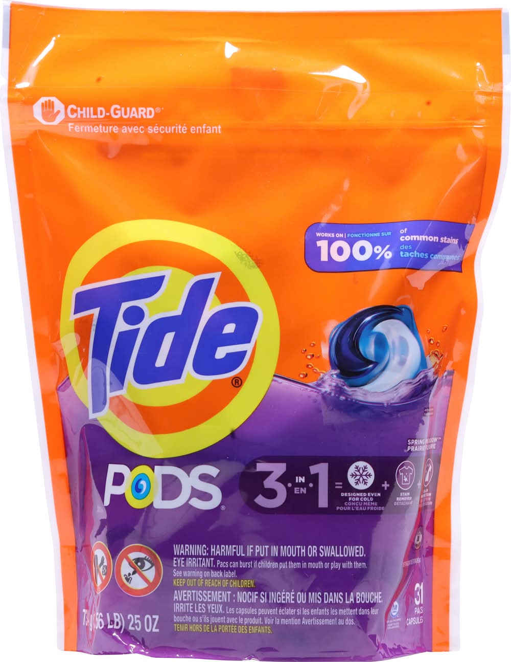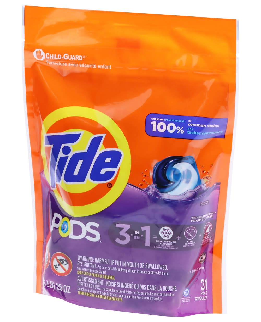 Discover the effortless, powerful clean of Tide PODS laundry detergent pacs, designed to work on 100% of common stains, even in cold water. With a 3-in-1 concentrated laundry detergent formula that combines stain removers, odor fighters, and color protectors, you get exceptional laundry cleaning performance in just one simple step. Tide PODS laundry soap pacs dissolves quickly, activating stain removal and odor fighting in any wash temperature. Say goodbye to grease stains and hello to fresh, vibrant laundry. Don't pay for water in your laundry detergent, pay for clean. Tide PODS laundry soap is concentrated with 3X the cleaning ingredients per laundry detergent dose compared to the leading bargain liquid detergent, ensuring you get the most out of every load. Just toss Tide PODS laundry soap pacs into thelaundry drum before adding clothes, it's that easy! For larger or heavily soiled loads, simply add another Tide POD. Transform your laundry routine with the long-lasting, springtime freshness of Tide Spring Meadow scent. Get the laundry detergent clean you love, effortlessly in 1 wash with Tide PODS, your 3-in-1 laundry detergent solution. Experience the power of Tide PODs laundry detergent pacs today! Includes one 31 Count pack of Tide PODs Laundry Detergent, Spring Meadow Scent, Laundry Detergent pacs Procter & Gamble, Cincinnati, OH, 45202
