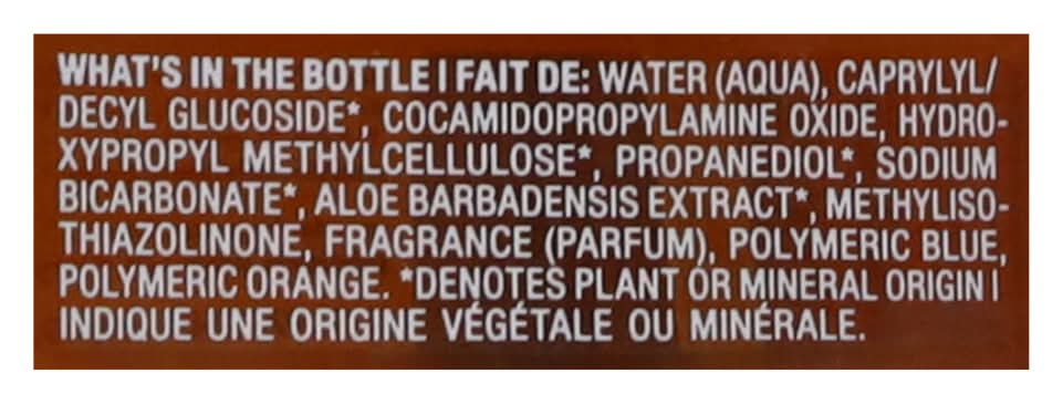 Ingredients: What's in the Bottle: Water (Aqua), Caprylyl/Decyl Glucoside (Denotes Plant or Mineral Origin), Cocamidopropylamine Oxide, Hydroxypropyl Methylcellulose (Denotes Plant or Mineral Origin), Propanediol (Denotes Plant or Mineral Origin), Sodium Bicarbonate (Denotes Plant or Mineral Origin), Aloe Barbadensis Extract (Denotes Plant or Mineral Origin), Methylisothiazolinone, Fragrance (Parfum), Polymeric Blue, Polymeric Orange