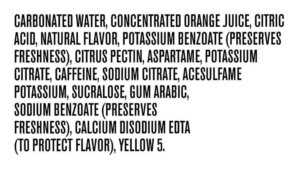 Ingredients: Carbonated Water, Concentrated Orange Juice, Citric Acid, Natural Flavor, Potassium Benzoate (Preserves Freshness), Citrus Pectin, Aspartame, Potassium Citrate, Caffeine, Sodium Citrate, Acesulfame Potassium, Sucralose, Gum Arabic, Sodium Benzoate (Preserves Freshness), Calcium Disodium EDTA (To Protect Flavor), Yellow 5 Contains 5400mg of caffeine