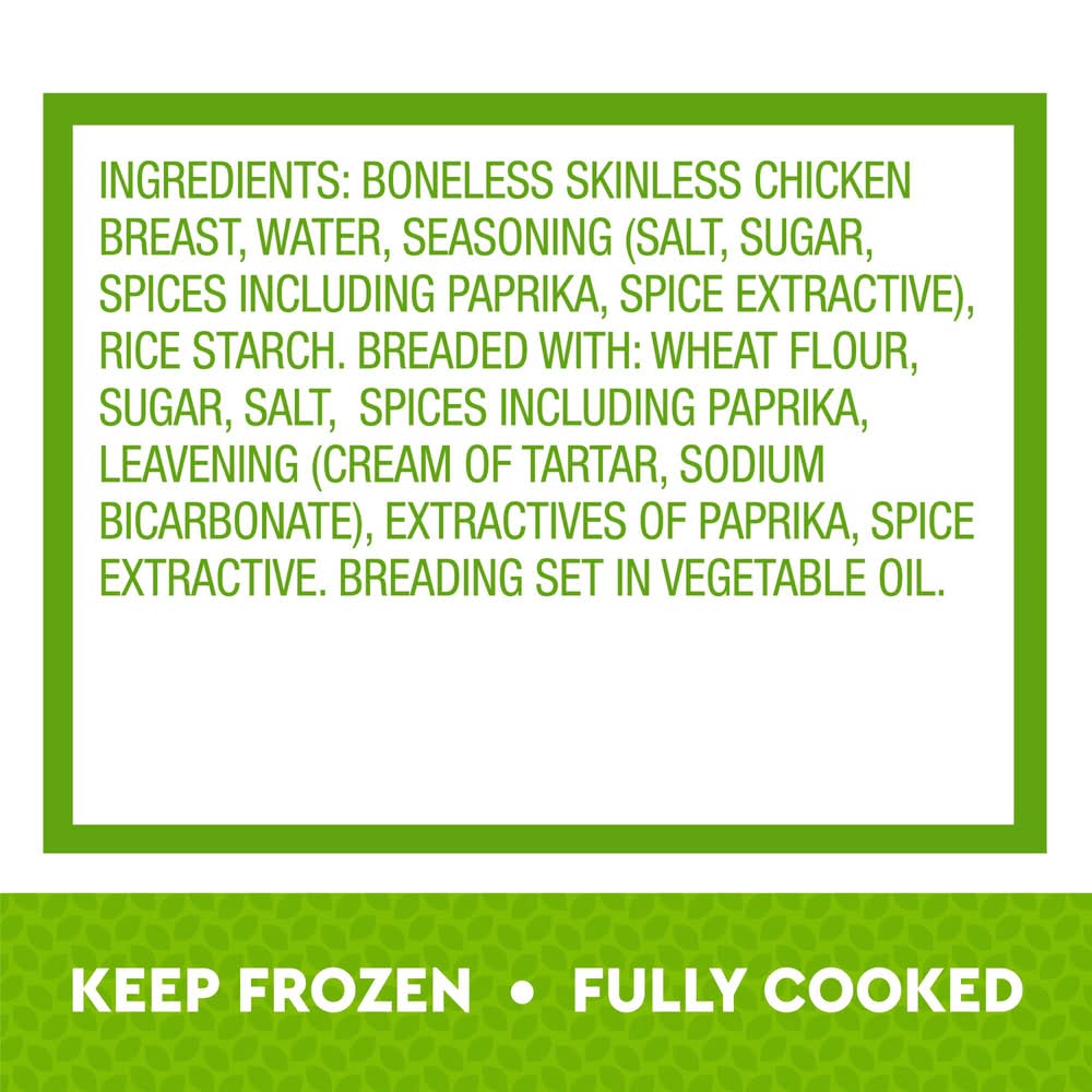 Ingredients: BONELESS SKINLESS CHICKEN BREAST, WATER, SEASONING (SALT, SUGAR, SPICES INCLUDING PAPRIKA, SPICE EXTRACTIVE), RICE STARCH. BREADED WITH: WHEAT FLOUR, SUGAR, SALT, SPICES INCLUDING PAPRIKA, LEAVENING (CREAM OF TARTAR, SODIUM BICARBONATE), EXTRACTIVE OF PAPRIKA, SPICE EXTRACTIVE. BREADING SET IN VEGETABLE OIL Contains: Wheat Contains: Contains: Wheat\nFree From: Eggs, Fish, Milk, Peanuts, Shellfish, Soy, Treenuts