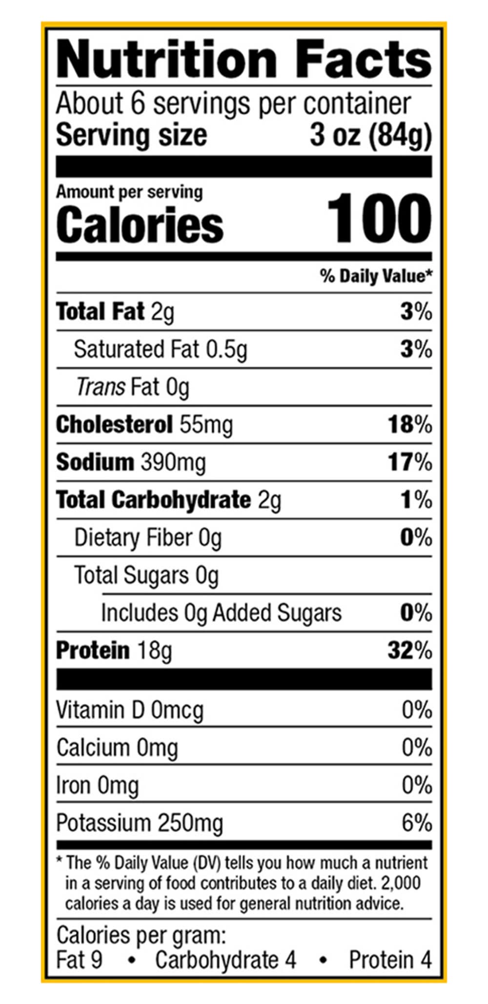 Ingredients: Chicken Breast with Rib Meat, Water, Contains 2% or Less of Food Starch, Salt, Natural Flavors