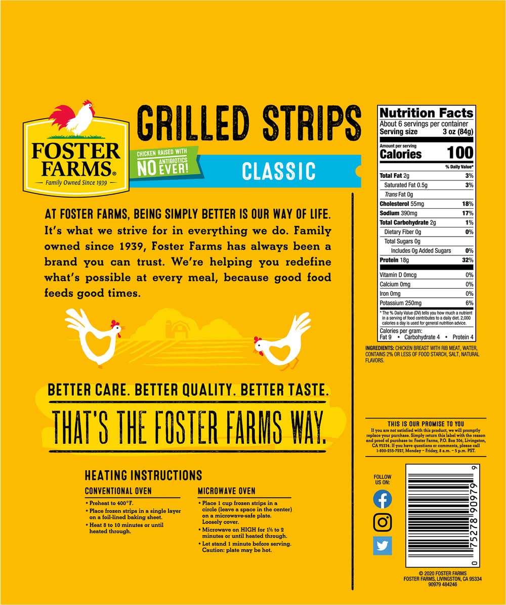 Premium chicken breast strips with rib meat. Family owned since 1939. Chicken raised with no antibiotics ever! Chicken raised with no added hormones (Federal regulations do not permit the use of hormones or steroids in poultry) or steroids (Federal regulations do not permit the use of hormones or steroids in poultry) ever! 100% all natural (Minimally processed. No artificial ingredients). Fully cooked. Microwaveable. No preservatives. At Foster Farms, being simply better is our way of life. It's what we strive for in everything we do. Serving families since 1939, foster farms has always been a brand you can trust. We're helping you redefine what's possible at every meal, because good food feeds good times. Better care. Better quality. Better taste. That's the Foster Farms way. This is our promise to you if you are not satisfied with this product, we will promptly replace your purchase. Simply return this label with the reason and proof of purchase to: Foster Farms, P.O. Box 306, Livingston, CA 95334. Number of servings: 6