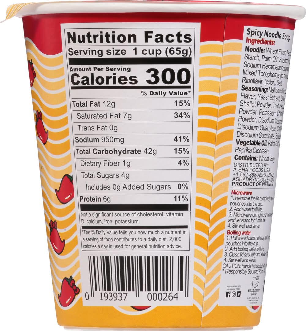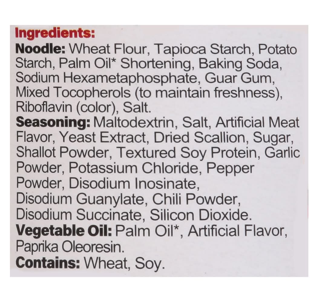 Ingredients: Noodle: Wheat Flour, Tapioca Starch, Potato Starch, Palm Oil (Responsibly Sourced with Palm Oil) Shortening, Baking Soda, Sodium Hexametaphosphate, Guar Gum, Mixed Tocopherols (to Maintain Freshness), Riboflavin (Color), Salt. Seasoning: Maltodextrin, Salt, Artificial Meat Flavor, Yeast Extract, Dried Scallion, Sugar, Shallot Powder, Textured Soy Protein, Garlic Powder, Potassium Chloride, Pepper Powder, Disodium Inosinate, Disodium Guanylate, Chili Powder, Disodium Succinate, Silicon Dioxide. Vegetable Oil: Palm Oil (Responsibly Sourced with Palm Oil), Artificial Flavor, Paprika Oleoresin Contains: Wheat, Soybeans