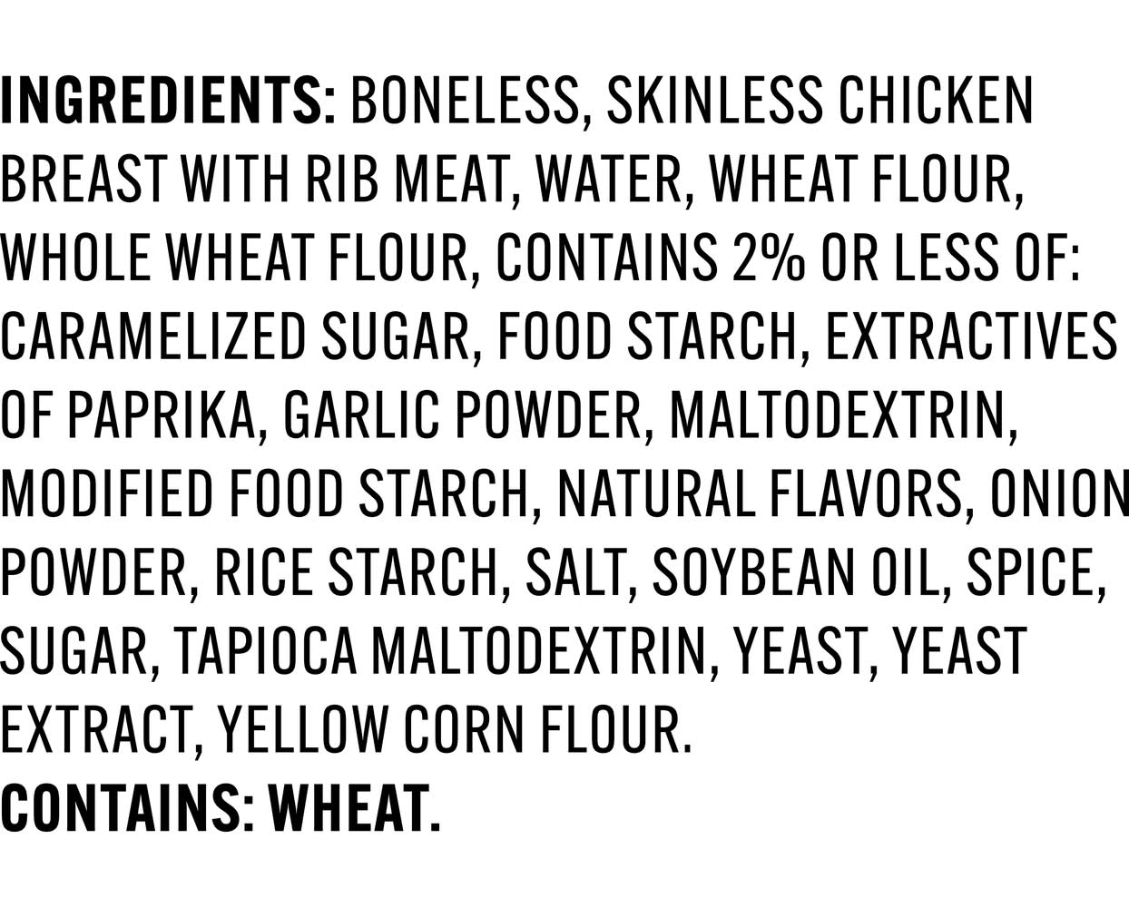 Ingredients: Boneless, Skinless Chicken Breast With Rib Meat, Water, Wheat Flour, Whole Wheat Flour, Contains 2% or Less of: Caramelized Sugar, Food Starch, Extractives Of Paprika, Garlic Powder, Maltodextrin, Modified Food Starch, Natural Flavors, Onion Powder, Rice Starch, Salt, Soybean Oil, Spice, Sugar, Tapioca Maltodextrin, Yeast, Yeast Extract, Yellow Corn Flour. Contains: Wheat