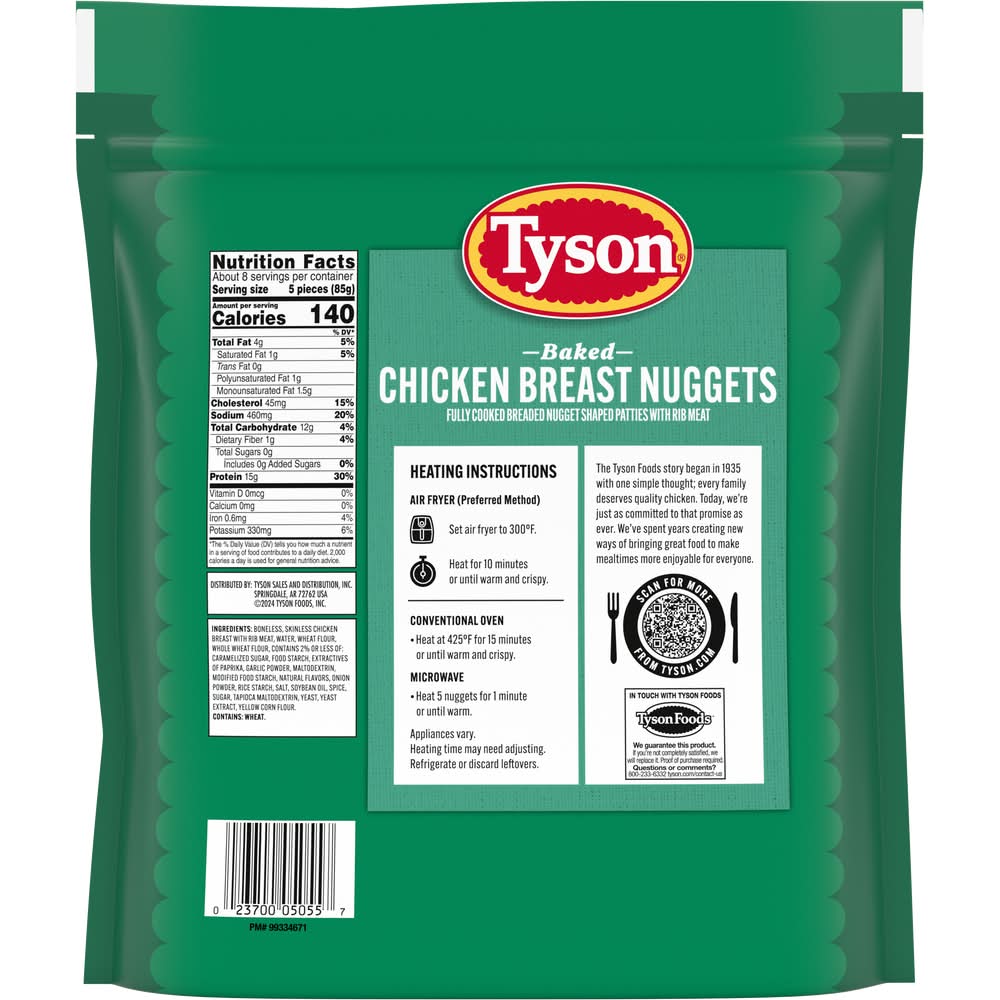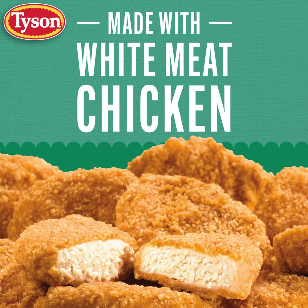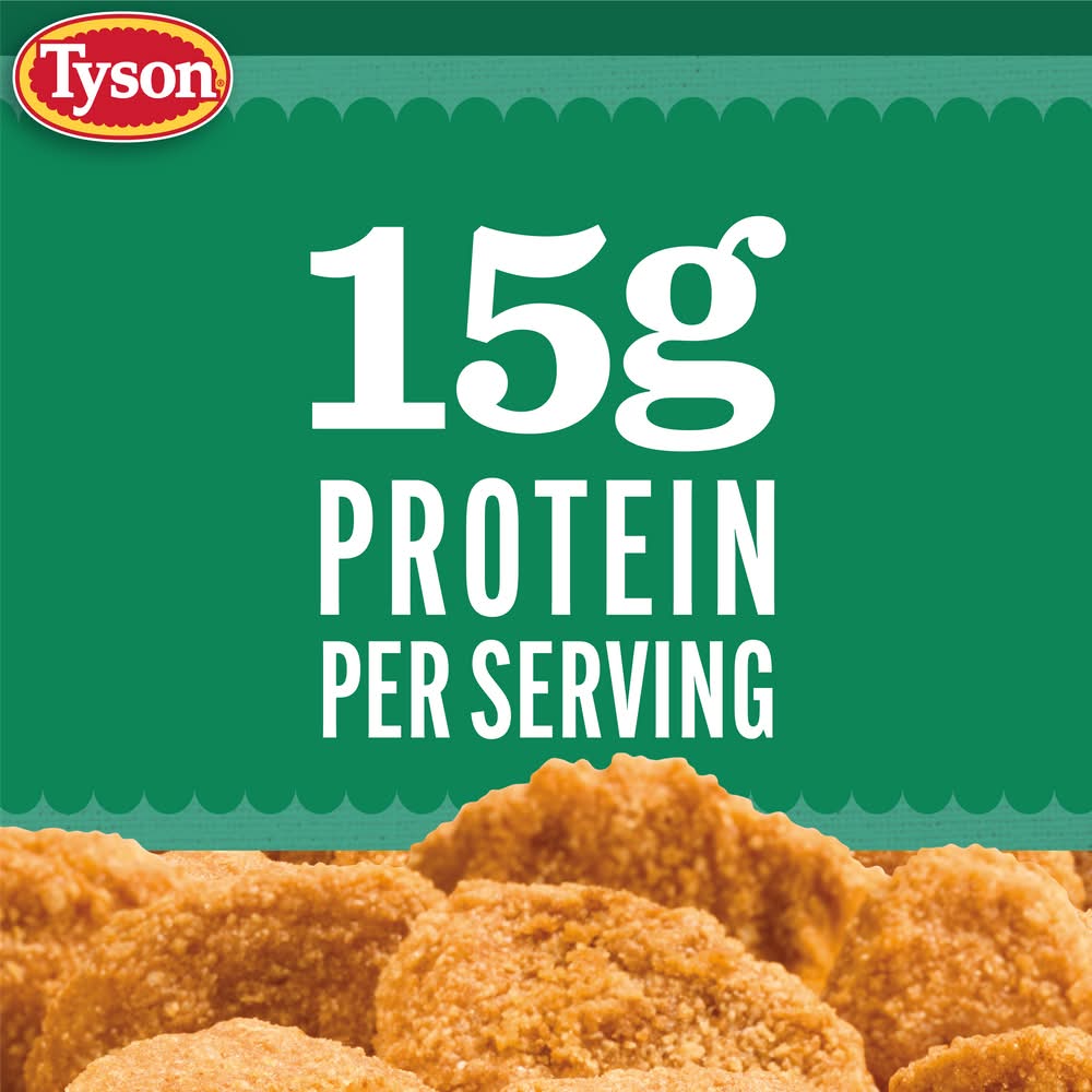 Fully cooked breaded nugget shaped pattie with rib meat. Air fried (Uses circulated hot air with a touch of oil to achieve a fried-like product and texture). No air fryer needed. Chicken Raised with: No added hormones or steroids (Federal regulations prohibit the use of added hormones or steroids in chicken). Pure crispy perfection. There's lots to love about fried chicken, and now you can enjoy its crispy delicious flavor in a whole new way. Made with white meat chicken that we seasoned, breaded then cooked with just a touch of oil and super-heated air for the ultimate air fried chicken. With less fat and amazing flavor. Tested for quality. Tyson Sales and Distribution, Inc., P.O. Box 2020, Springdale, AR, 72765-2020