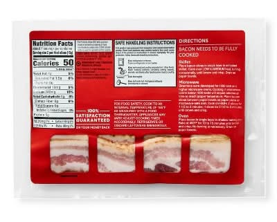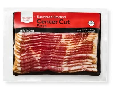Enjoy a breakfast classic any time of day with this 12-Ounce Hardwood Smoked Center Cut Bacon from market pantry™. This perfectly cured and hand-selected bacon is naturally hardwood smoked for a rich, smoky flavor, and each slice is center cut. It’s gluten-free and has no added MSG so you can be confident you’ll enjoy pure flavor. Whether you’re frying it alongside a couple eggs or putting some on a cheeseburger, this hardwood smoked bacon is sure to be a classic staple in your kitchen. Directions Bacon needs to be fully cooked. Skillet Place bacon slices in single layer in unheated skillet. Cook over LOW to MEDIUM heat, turning occasionally, until brown and crisp. Drain on paper towels. Microwave Directions were developed for 1000 watt and higher microwave ovens. Cooking in microwave ovens below 1000 watts will require additional time to reach proper temperature. Place bacon slices between paper towels on paper plate or microwave-safe dish. Cook on HIGH: 2 slices for 1 1/2 to 2 minutes; 4 slices for 2 1/2 to 3 minutes, until brown and crisp. Oven Place bacon in single layer in shallow baking pan. Bake at 400°F for 10 to 15 minutes until brown and crisp. No turning is necessary. Drain on paper towels. For food safety, cook to an internal temperature of 165°F as measured with a food thermometer. Appliances may vary; adjust cooking time accordingly. Refrigerate or discard leftovers immediately.