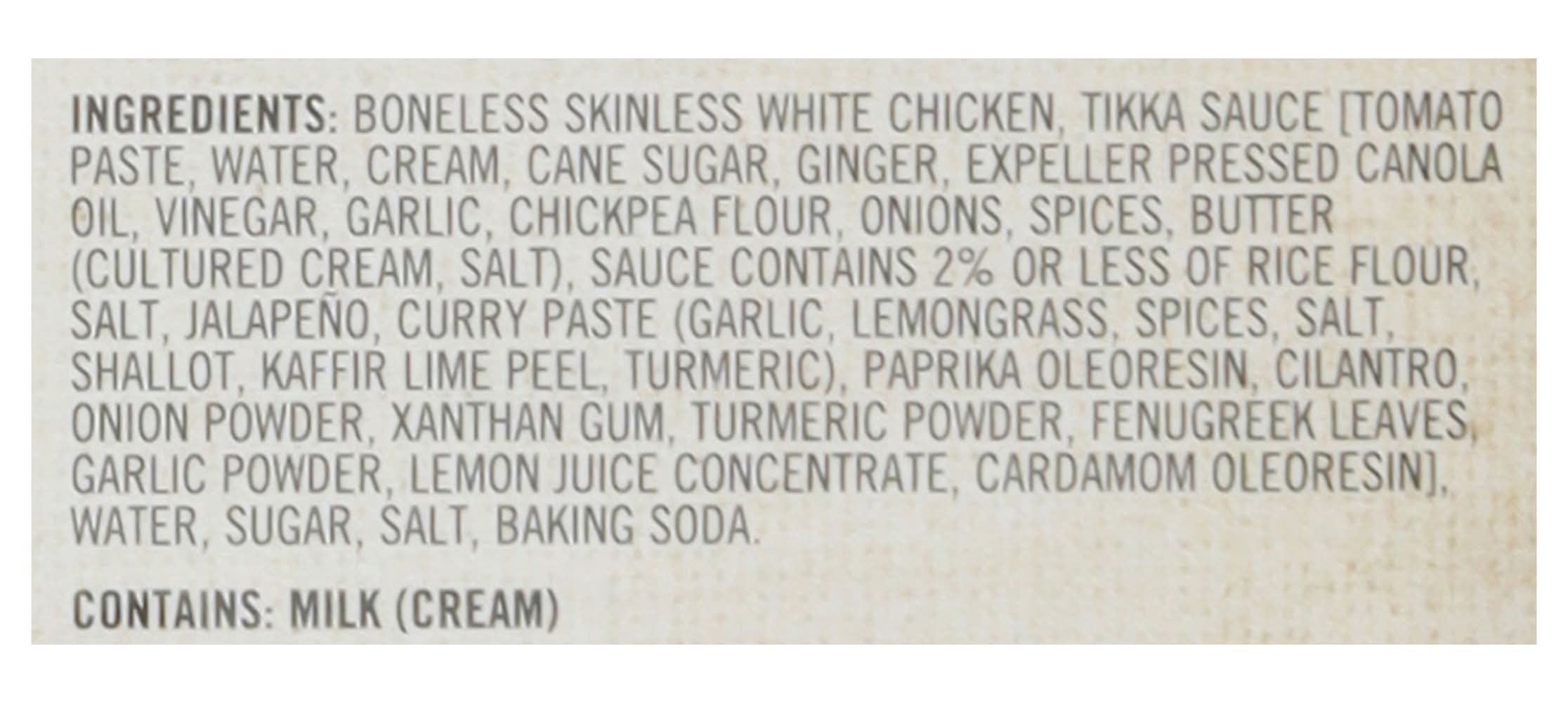 Ingredients: Boneless Skinless White Chicken, Tikka Sauce [Tomato Paste, Water, Cream, Cane Sugar, Ginger, Expeller Pressed Canola Oil, Vinegar, Garlic, Chickpea Flour, Onions, Spices, Butter (Cultured Cream, Salt), Sauce Contains 2% or Less of Rice Flour, Salt, Jalapeno, Curry Paste (Garlic, Lemongrass, Spices, Salt, Shallot, Kaffir Lime Peel, Turmeric), Paprika Oleoresin, Cilantro, Onion Powder, Xanthan Gum, Turmeric Powder, Fenugreek Leaves Garlic Powder, Lemon Juice Concentrate, Cardamom Oleoresin], Water, Sugar, Salt, Baking Soda Contains: Milk