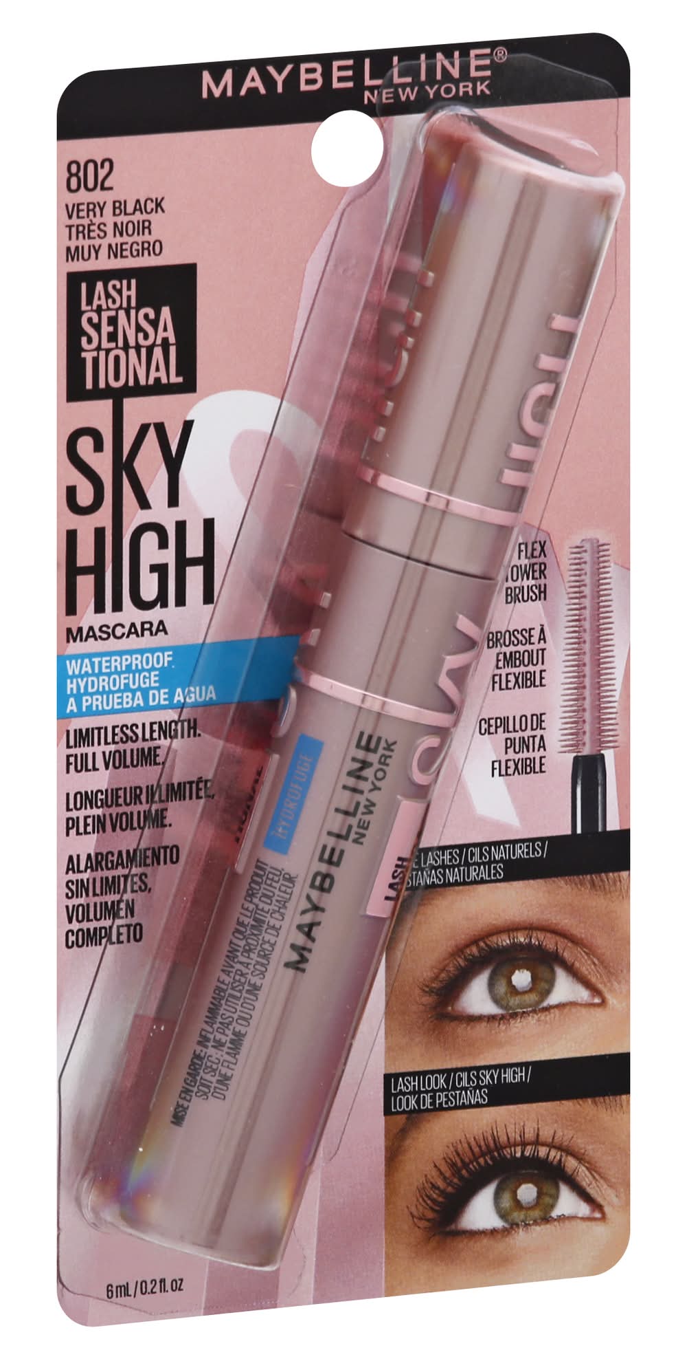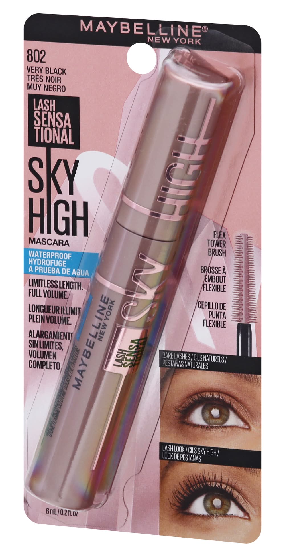 New York. Limitless length full volume. Flex tower brush. Bare lashes. Lash look. Waterproof mascara. Introducing lash sensational sky high our first mascara made for full volume and authentic length. Custom flex brush grips and extends every lash. Formula, with bamboo extract and fibers, gives authentic impact. No smudging, flake-resistant. Up to 24hr wear. Allergy tested. Ophthalmologist tested. Suitable for contact lens wearers. • Color: 802 very black • Maybelline LLC, New York,NY,10001