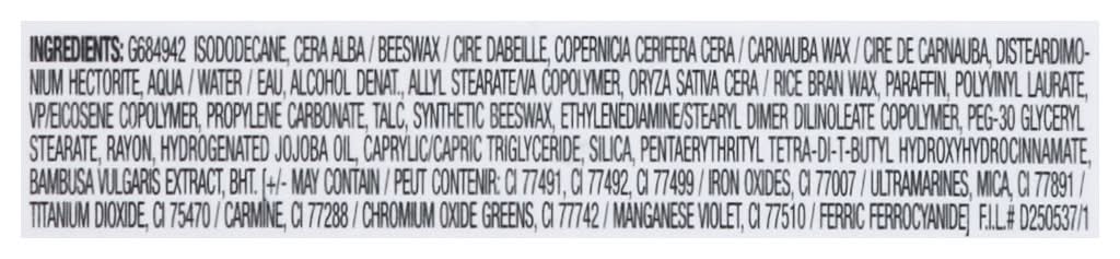 Ingredients: Isododecane, Cera Alba/Beeswax/Cire Dabeille, Copernicia Cerifera Cera/Carnauba Wax/Cire De Carnauba, Disteardimonium Hectorite, Aqua/Water/Eau, Alcohol Denat. Allyl Stearate/VA Copolymer, Oryza Sativa Vera/Rice Bran Wax, Paraffin, Polyvinyl Laurate, VP/Eicosene Copolymer, Propylene Carbonate, Talc, Synthetic Beeswax, Ethylenediamine/Stearyl Dimer Dilinoleate Copolymer, PEG-30 Glyceryl Stearate, Rayon, Hydrogenated Jojoba Oil, Caprylic/Capric Triglyceride, Silica, Pentaerythrityl Tetra-Di-T-Butyl Hydroxyhydrocinnamate, Bambusa Vulgaris Extract, BHT, [+/- May Contain/Peut Contenir: CI 77491, CI 77492, CI 77499/Iron Oxides, CI 77007/Ultramarines, Mica, CI 77891/Titanium Dioxide, CI 75470/Carmine, CI 77288/Chromium Oxide Greens, CI 77742/Manganese Violet, CI 77510/Ferric Ferrocyanide]