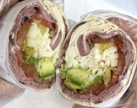 Lean Pastrami served cold with mayonnaise, string cheese, tomatoes, avocados, and peppercinis